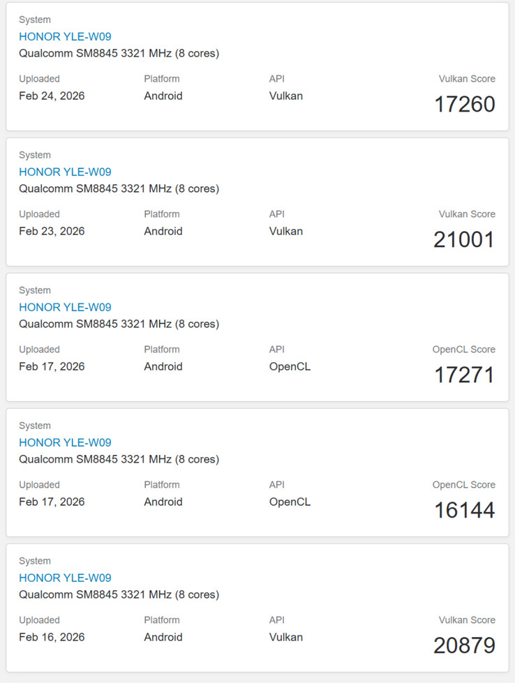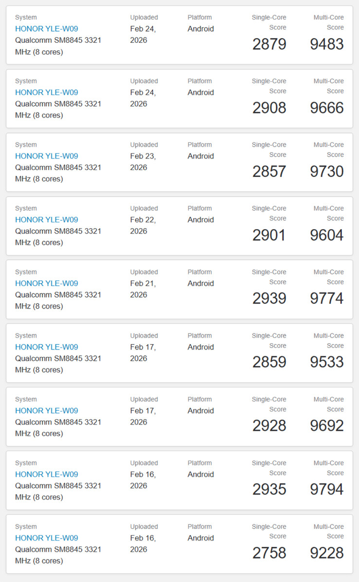 Zoals altijd geeft Geekbench een modelnummer in plaats van een verkoopnaam. Honor heeft echter al bevestigd dat de MagicPad 4 geassocieerd wordt met het modelnummer 'YLE-W09'. We vermoeden dus dat de hieronder weergegeven resultaten door reviewers zijn behaald in de aanloop naar de officiële release van de tablet op 2 maart.