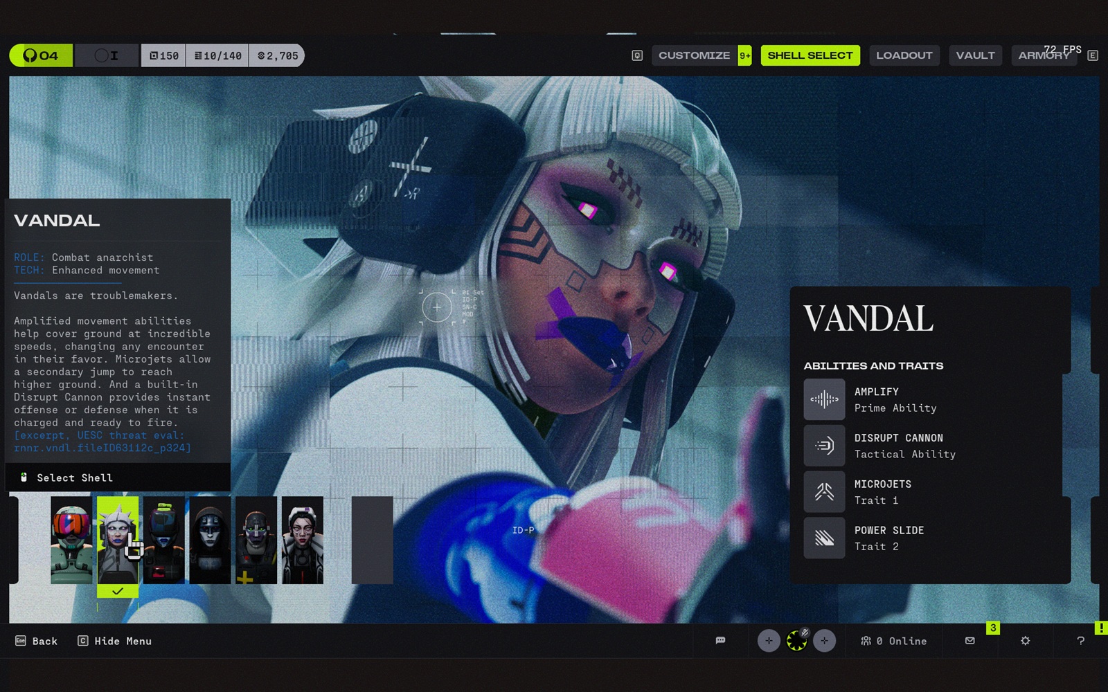 Die visuele identiteit is ook buiten de wedstrijden te zien. De shell-schermen die vooraf worden getoond zien er gestroomlijnd, gepantserd, synthetisch en een beetje onpersoonlijk uit, meer als gespecialiseerde lichamen die zijn gemaakt voor hun functie dan als heldhaftige personages die zijn gemaakt voor zelfexpressie. De donkere beplating, harde silhouetten, vizierzware ontwerpen en neonomrande menu's versterken hetzelfde idee: dit zijn gereedschappen die worden ingezet in een vijandig systeem. Het past veel beter bij de wereld van Marathondan een meer conventionele hero-shooter presentatie zou hebben gedaan.