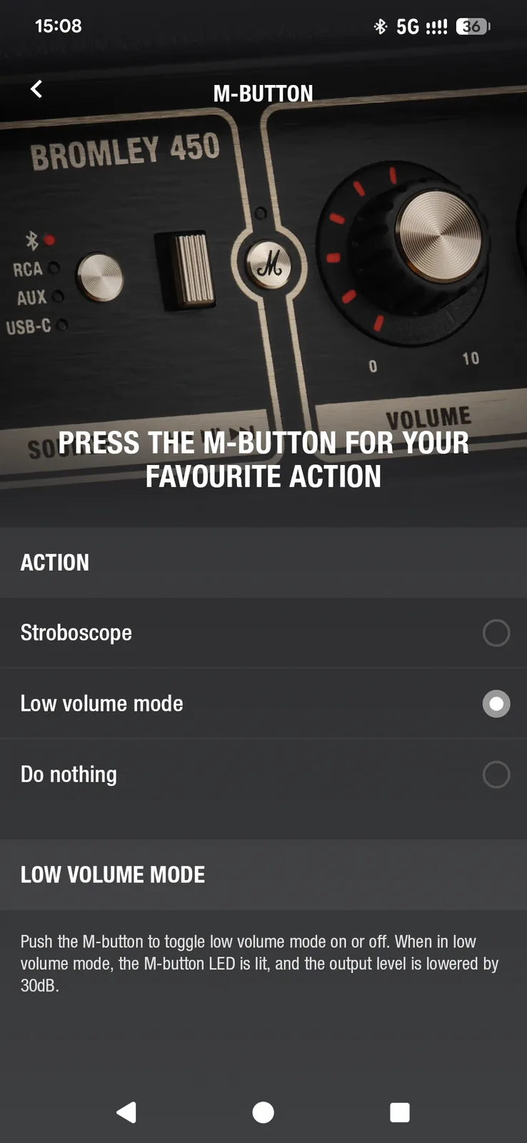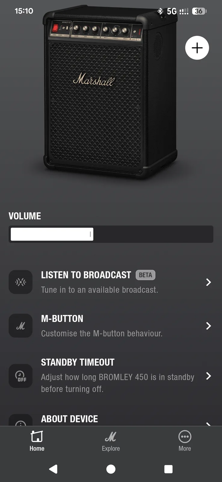 De Bromley gebruikt dezelfde app als de hoofdtelefoons van Marshall. De Marshall Bluetooth app ziet er netjes uit en is gemakkelijk te navigeren, maar het ontbreekt aan functies. U hebt hem voornamelijk nodig voor Auracast (het koppelen van meerdere compatibele luidsprekers) en het configureren van de M-knop, die momenteel slechts één van de twee toewijsbare functies ondersteunt. Naast volumeregeling is er niet veel dat u op afstand kunt aanpassen - geen EQ, geen treble of bass tweaks.