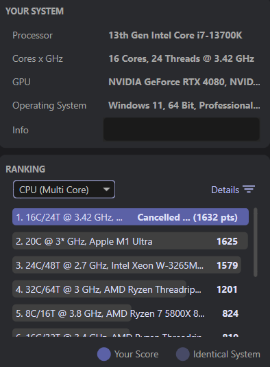 Door de complexiteit van de uniforme benchmarkscène is de lengte van de single core test nu aanzienlijk verlengd. Ter referentie, de multi-core test op een i7-13700K minder dan 2 minuten, maar de single core test duurt ongeveer 14 minuten. Maxon heeft enkele vergelijkende resultaten toegevoegd voor Apple's M1 familie, en het lijkt erop dat de M1 Max en M1 Ultra bijna net zo snel zijn als een i7-13700K, met een achterstand van slechts 9 punten. De multikernresultaten zijn ook erg goed, met een achterstand van slechts 7 punten voor de M1 Ultra. Interessant genoeg lijkt de 2024 multi-core test de i7-13700K niet zo zwaar te belasten als de R23 release, aangezien de temperaturen nauwelijks boven de 90° C komen, terwijl ze in R23 de 95° C bereikten. Aan de GPU-kant heeft Maxon een nogal vreemde selectie vergelijkende resultaten opgenomen waarin de huidige generatie modellen van Nvidia en AMD ontbreken.