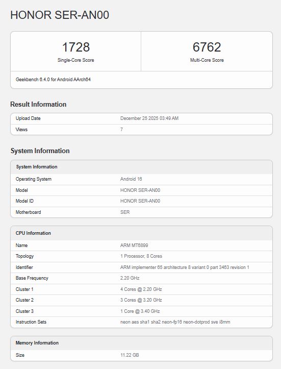 Het geteste apparaat staat vermeld met de identificatie "Honor SER-AN00" en is uitgerust met 12 GB RAM. Qua prestaties lijkt de Dimensity 8500 niet significant beter te presteren dan de Dimensity 8400. De chipset levert een single-core score van 1.728 op zijn best, en een multi-core score van 6.762. Ter vergelijking: de Dimensity 8400 scoort gemiddeld 1.621 en 6.208 op dezelfde tests.
