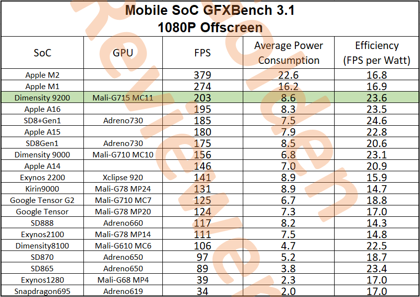 Deze cijfers zijn ook niet specifiek voor 3DMark's test, want ze worden weerspiegeld door GFXBench's 1080P en 1440 Vulkan tests: de Dimensity 9200 gaat consequent verder dan de A16 Bionic in termen van zowel vermogen als efficiëntie. Voor de lancering van de chipset, werd er gezegd dat het en de Snapdragon 8 Gen 2beter zouden presteren dan Apple's A16 Bionic GPU-wise. Het lijkt erop dat deze beweringen niet ongegrond waren