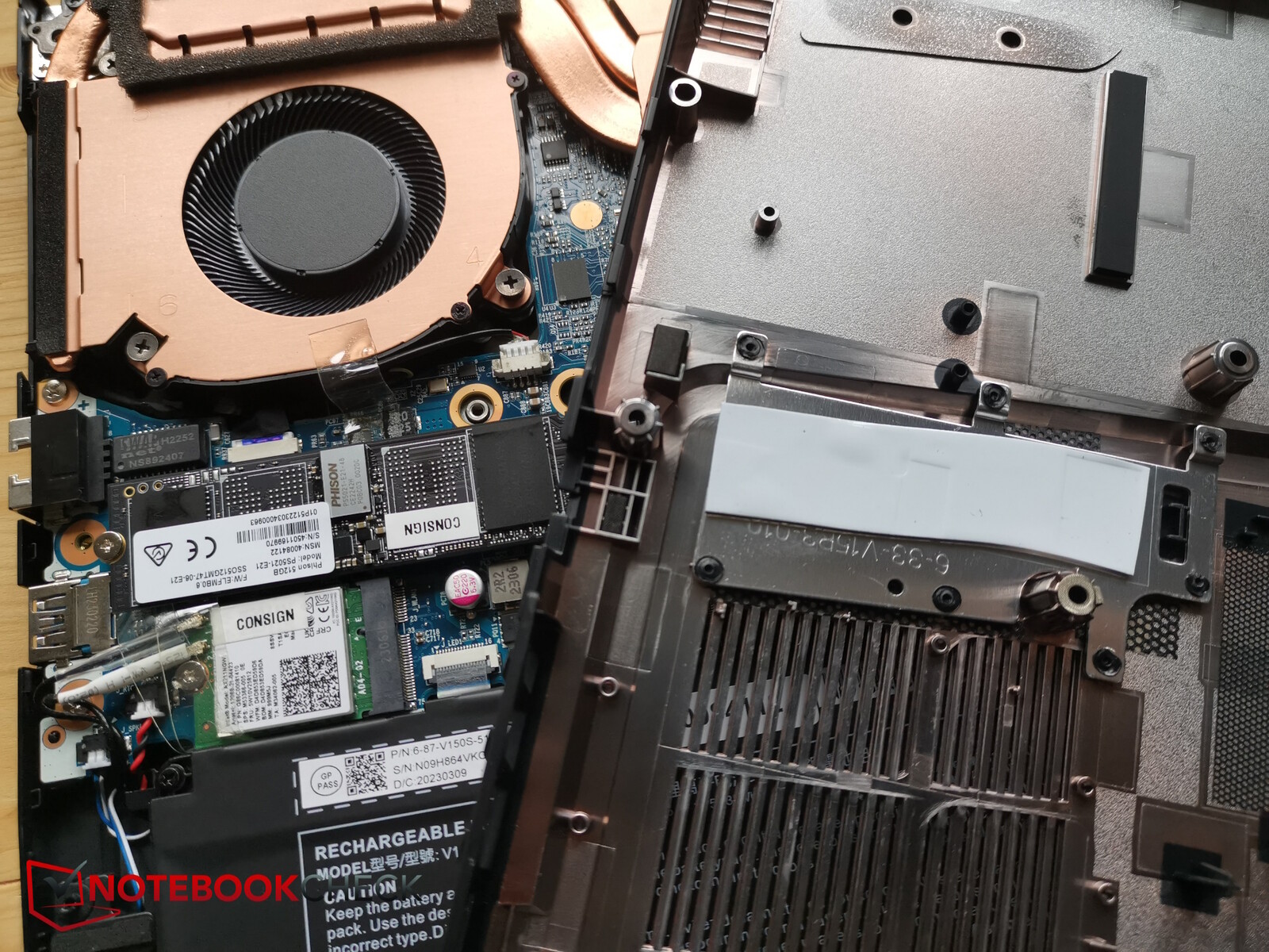 Om bij de interne onderdelen te komen, moet u 14 kruiskopschroeven van dezelfde grootte verwijderen. Daarna kunt u de plastic bodemplaat er gemakkelijk aftrekken. Daaronder vindt u een koelsysteem met veel koper, een geschroefde batterij, twee RAM-sleuven, de SSD gekoeld door twee pads en de verwisselbare WiFi-module.