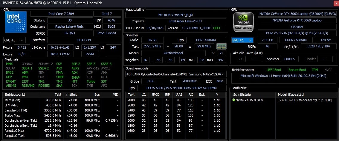 | Medion Erazer Deputy 15 P1 MD62761 Intel Core 7 250H ⎘ NVIDIA GeForce RTX 5060 Laptop ⎘ 16 GB Geheugen, 1024 GB | Catalogusprijs: 1300 EUR | 2.2 kg | 29 mm | 15.60" 1920x1080 141 PPI IPS | |
