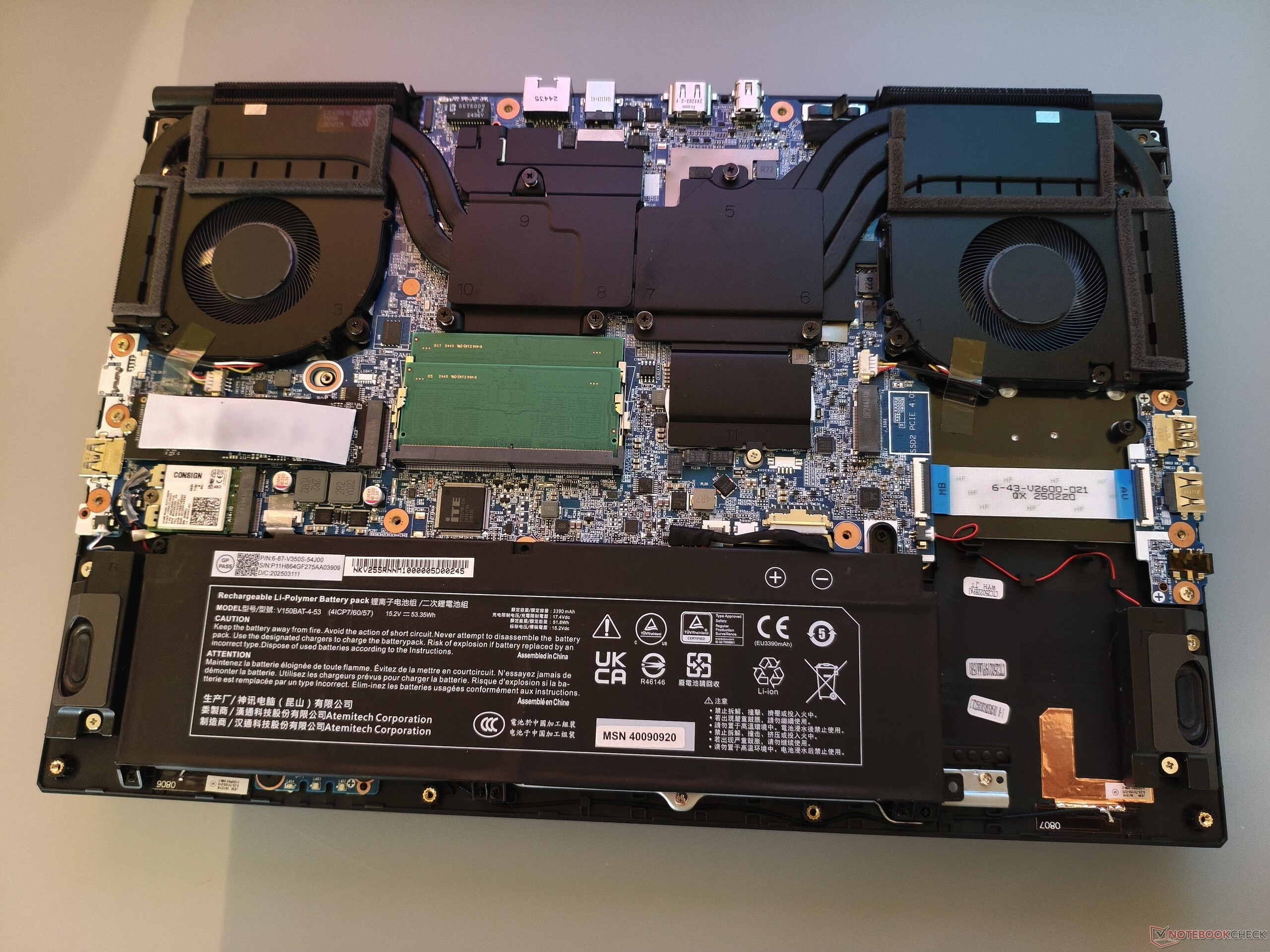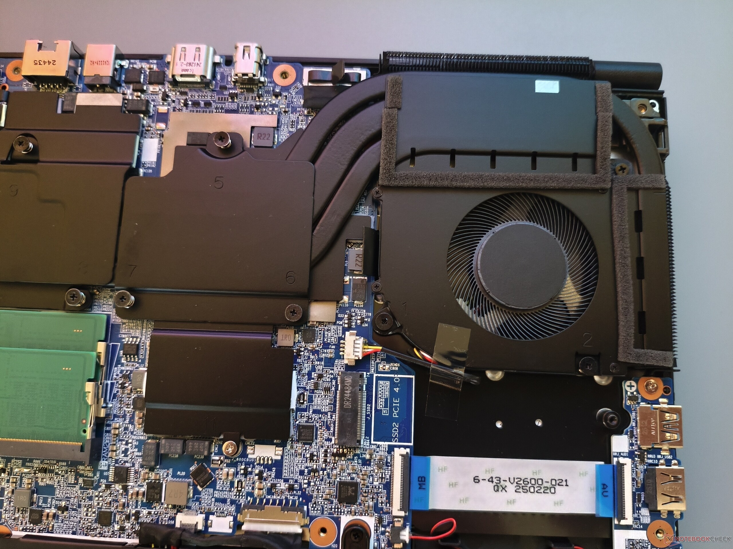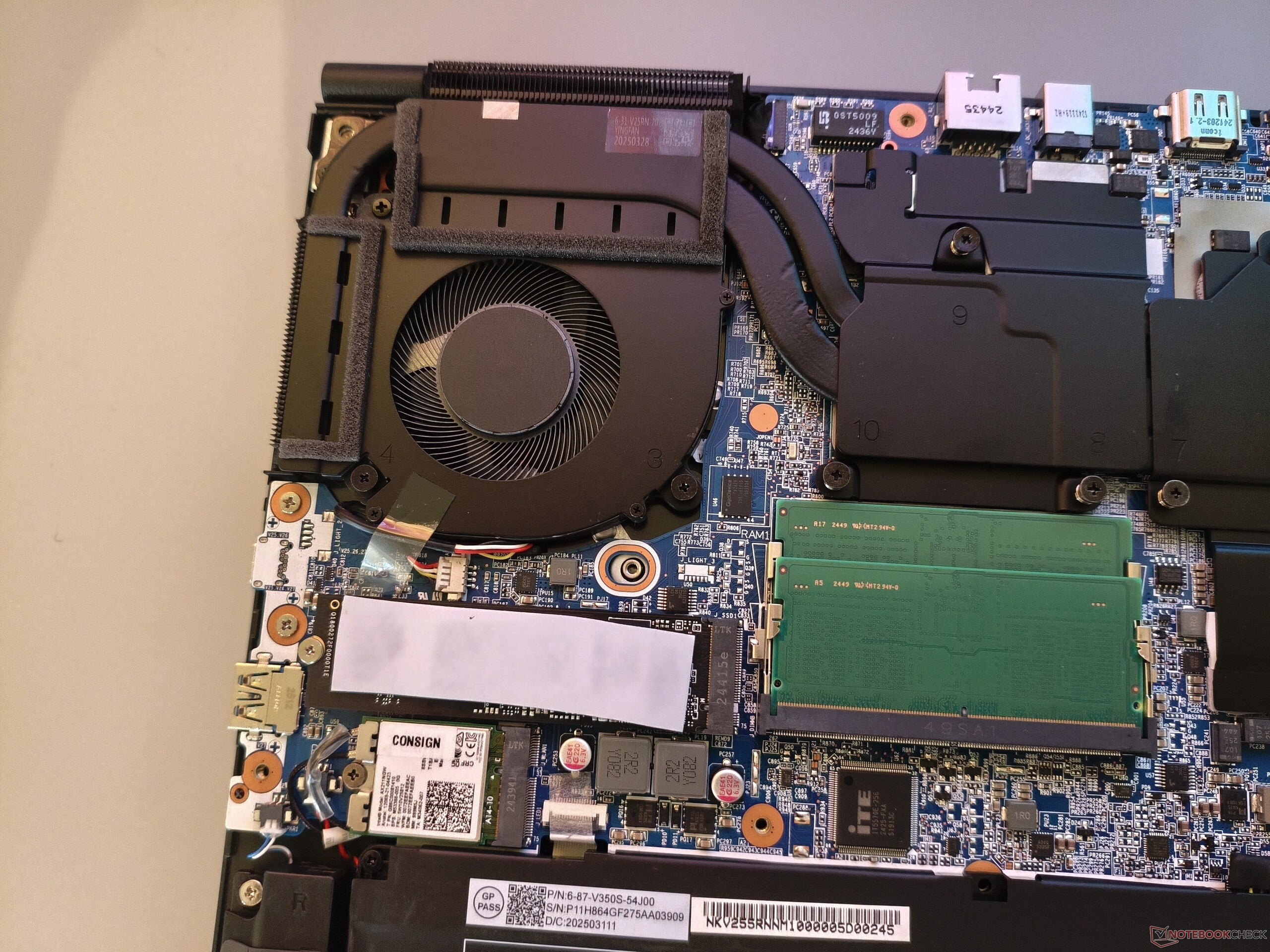 Afgezien van het ontbreken van USB 4/Thunderbolt ondersteuning en een kaartlezer, is de connectiviteit meer dan solide. Het 15-inch model heeft drie USB-A poorten, een Type-C poort, een audio-aansluiting, een RJ45 poort en een Kensington slot. Externe beeldschermen kunnen rechtstreeks worden aangesloten via HDMI of Mini DisplayPort. De draadloze module van Intel (AX211) presteert goed tot zeer goed, terwijl de beeldscherpte van de webcam matig is. Het bodempaneel kan worden verwijderd na het losdraaien van 13 kruiskopschroeven. Zoals op de onderstaande foto's te zien is, biedt de Deputy 15 P1 twee RAM-sleuven en twee SSD-sleuven, wat een pluim verdient.
