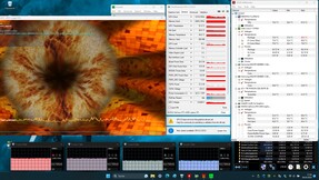De stresstest (waarbij Prime95 en Furmark constant draaien) vertegenwoordigt een extreem scenario dat we gebruiken om de stabiliteit van het systeem onder volledige belasting te evalueren. De CPU begint de test met middelhoge kloksnelheden (P: 3,4 tot 3,7 GHz, E: 2,8 tot 2,9 GHz), en de GPU draait op 2,3 GHz. Gedurende de test nemen de kloksnelheden van de CPU en GPU af.