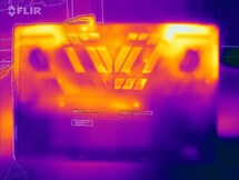 De laptop warmt hooguit matig op. De hoogste temperatuur wordt bereikt tijdens de stresstest, met 41 °C (106 °F) op een enkel meetpunt. Bij dagelijks gebruik blijven de temperaturen binnen het groene bereik.