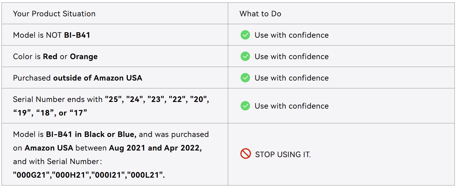 De officiële aankondiging https://iniushop.com/pages/recall-b41 van Iniu maakt het makkelijker voor gebruikers die misschien in de war zijn over de terugroepactie. Het bedrijf stelt dat als de powerbank niet bij Amazon gekocht is, deze niet onder de terugroepactie valt en gebruikers hem "met een gerust hart" kunnen blijven gebruiken