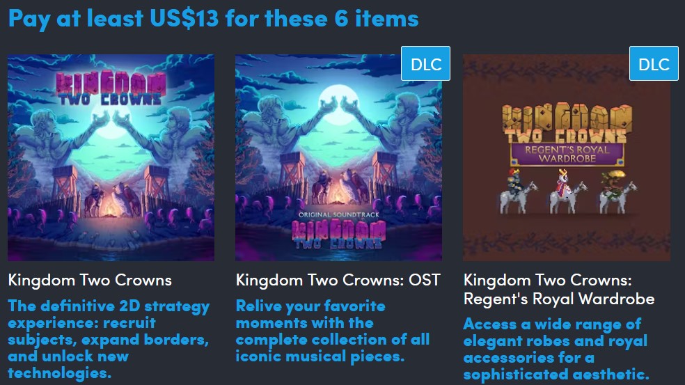 - Kingdom Two Crowns - OST: Deze DLC voegt een soundtrack toe aan het basisspel. Deze is $9,99 waard.