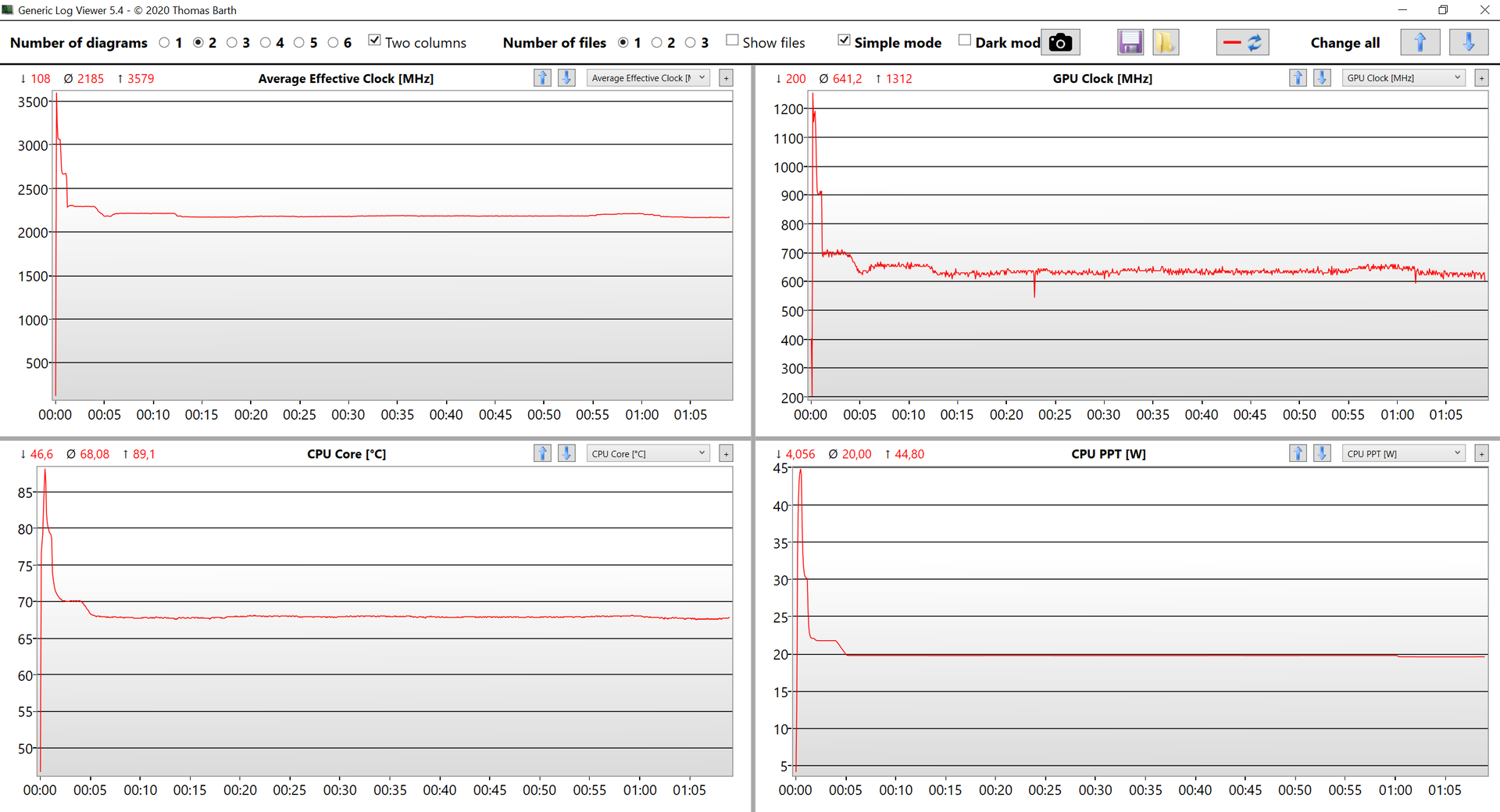 In de stresstest komt het stroomverbruik al snel uit op 20 watt, die de CPU en iGPU moeten delen. De 8 processorkernen draaien dan nog steeds op een kloksnelheid van ~2,2 GHz en de iGPU op ~640 MHz. Direct na de stresstest worden de prestaties niet beïnvloed.