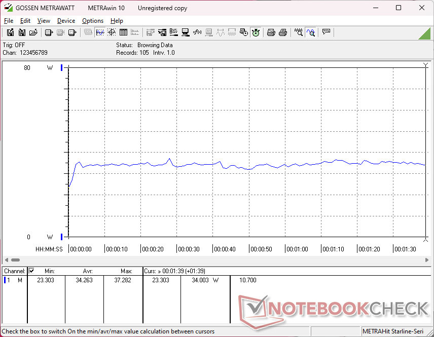 We kunnen een maximaal stroomverbruik van 65 W uit de kleine (~9 x 5 x 2,5 cm) 65 W AC-adapter registreren wanneer de CPU voor 100% wordt gebruikt. Dit is echter maar tijdelijk, want de kloksnelheden worden na een paar seconden automatisch teruggedraaid om de temperatuur onder controle te houden, net als op de meeste andere laptops met CPU's uit de U-serie.