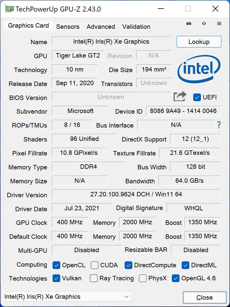 | Microsoft Surface Pro 8, i7-1185G7 Intel Core i7-1185G7, Intel Iris Xe Graphics G7 96EUs | Lenovo ThinkPad X12 20UVS03G00 Intel Core i7-1160G7, Intel Iris Xe Graphics G7 96EUs | Dell Latitude 13 7320 Detachable, i7-1180G7 Intel Core i7-1180G7, Intel Iris Xe Graphics G7 96EUs | Apple iPad Pro 12.9 2021 A2378 Apple M1, Apple M1 8-Core GPU | Microsoft Surface Pro 7 Plus Intel Core i5-1135G7, Intel Iris Xe Graphics G7 80EUs | |
