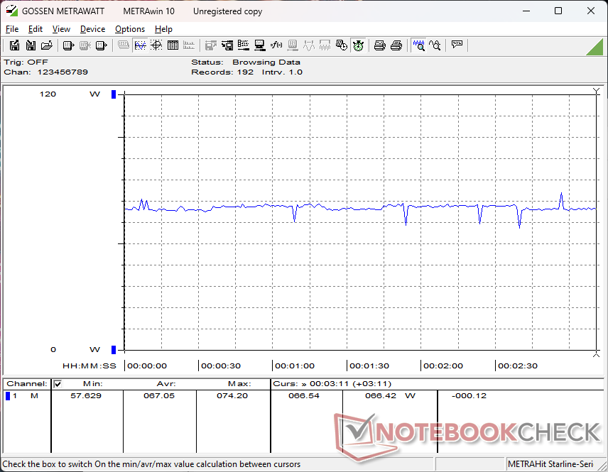 We zijn in staat om een maximaal verbruik van 110 W te registreren, ook al is de kleine-medium (~12,2 x 5,9 x 2,7 cm) USB-C wisselstroomadapter slechts berekend op 100 W. Dit maximale verbruik is slechts tijdelijk, zoals blijkt uit onze onderstaande grafiek, vanwege thermische beperkingen. Het is niettemin veel hoger dan wat we op de Inspiron 16 7635 2-in-1 vaststelden, dankzij het hogere Turbo Boost-potentieel van de Core H-serie CPU.