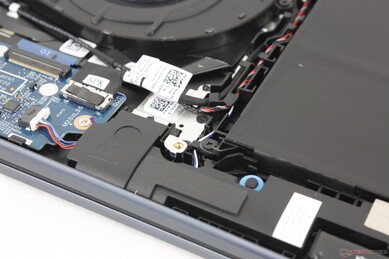 Er zijn verschillende interne verschillen tussen ons model en de Inspiron 16 7635 2-in-1 van vorig jaar. Met name de SSD is verplaatst om ruimte te maken voor de grotere ventilator en batterij, terwijl de heat pipe nu iets dikker is om de kortere lengte te compenseren. Secundaire SSD's worden nog steeds niet ondersteund en het RAM-geheugen kan niet door de gebruiker worden geüpgraded.