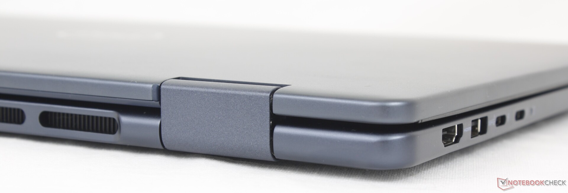 Poortopties en positionering blijven identiek aan die van de Inspiron 16 7635 2-in-1 of 7630 2-in-1, ondanks de vele veranderingen aan de buitenkant. Merk op dat Thunderbolt 4 opnieuw alleen beschikbaar is op de Intel SKU's en dat de HDMI-poort nog steeds alleen versie 1.4 is.
