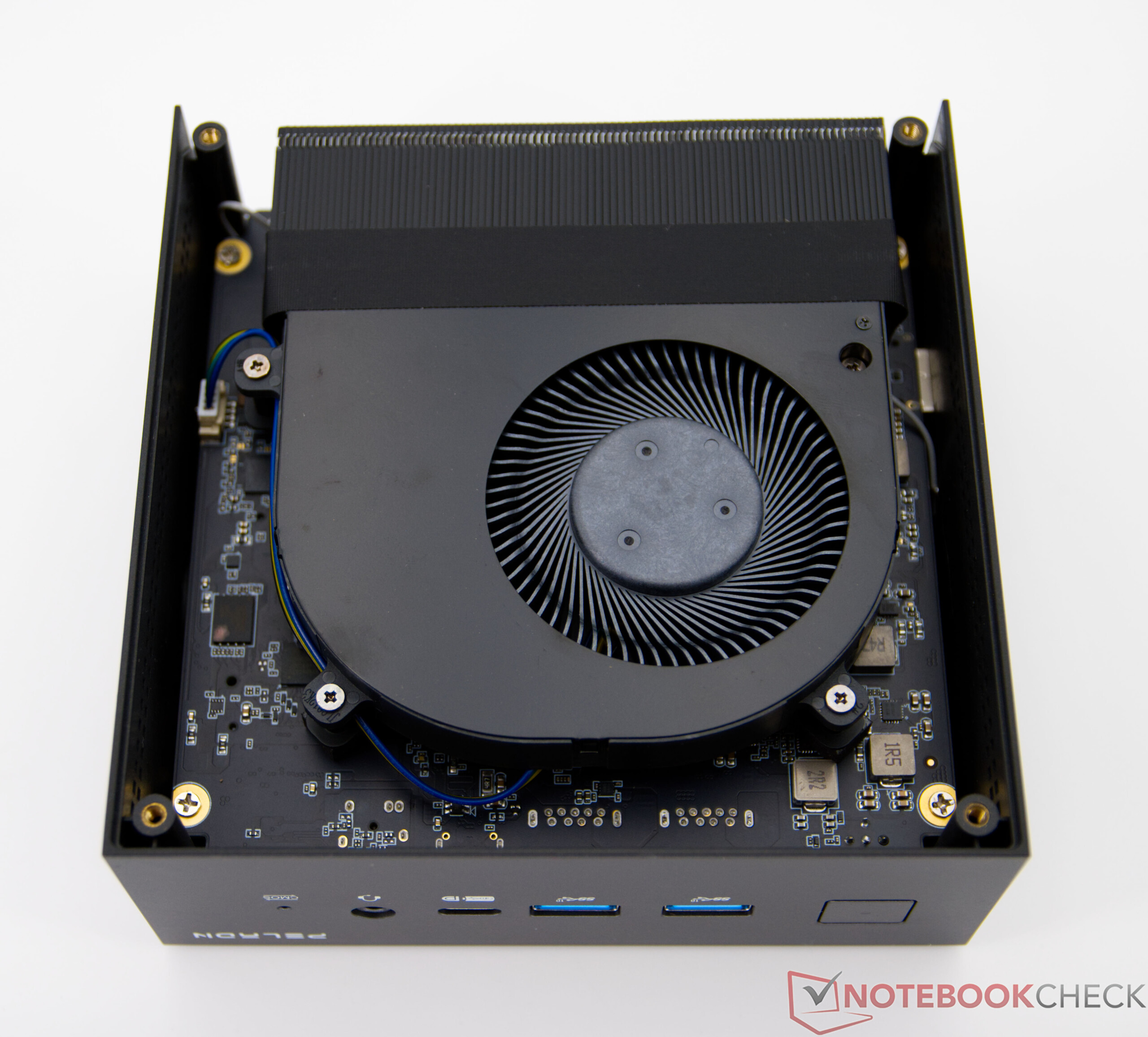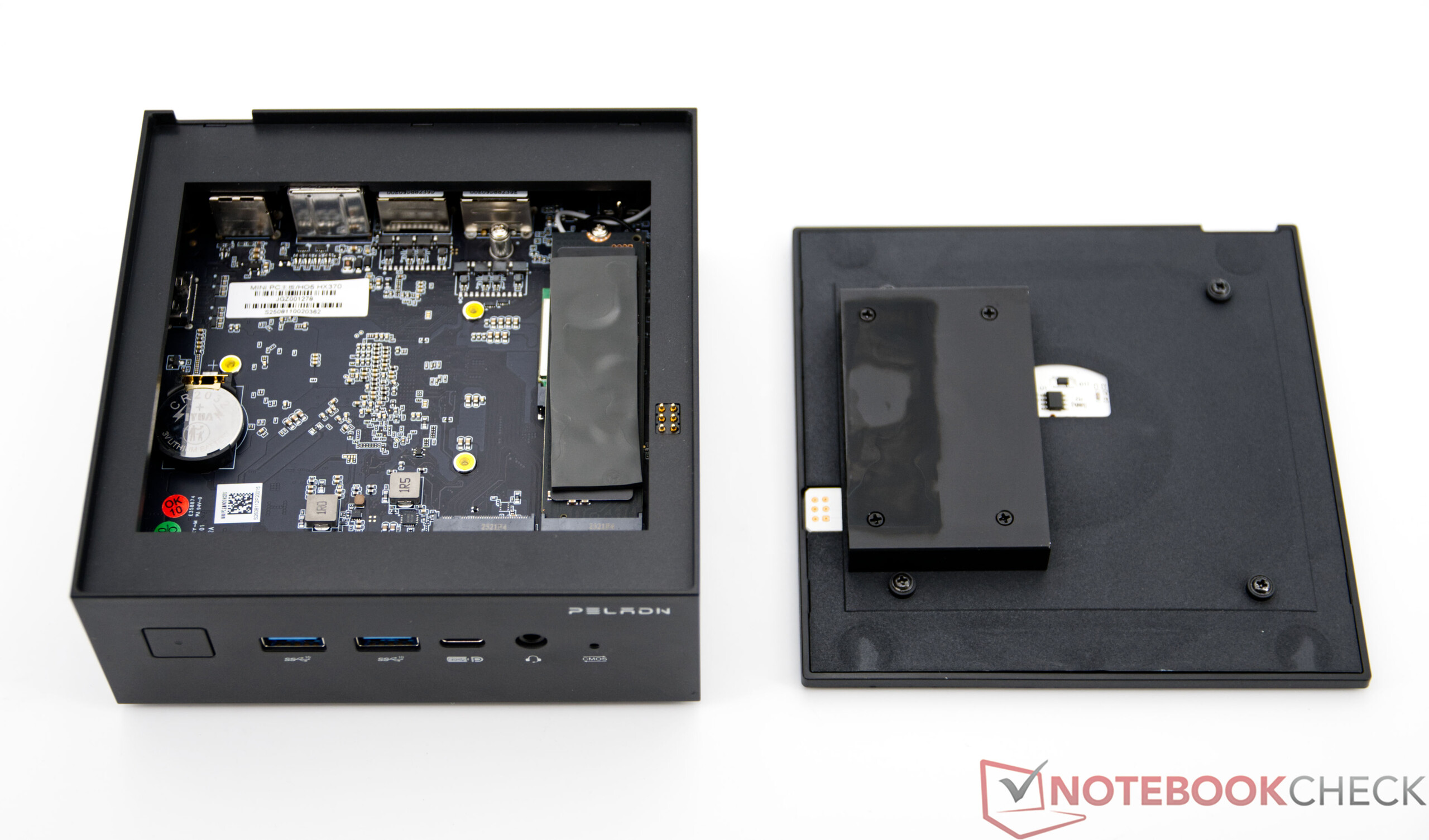 De Peladn HO5 is alleen verkrijgbaar met een voorgeïnstalleerde SSD en gesoldeerd RAM. Er is echter een extra sleuf voor extra massaopslag beschikbaar. De bovenkant kan zonder gereedschap worden verwijderd en biedt snelle toegang tot de componenten. De onderkant moet worden verwijderd om bij de CPU-ventilator te kunnen.