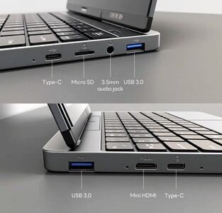 De mini-laptop wordt aangedreven door een Intel-processor N150uitgerust met slechts vier Gracemont efficiency-kernen geklokt op maximaal 3,6 GHz, die net genoeg prestaties leveren voor minder veeleisende taken. Desalniettemin bevat de notebook een relatief breed scala aan I/O-opties, zoals twee USB-C poorten, twee USB-A poorten, een Mini HDMI-interface en een microSD-kaartsleuf