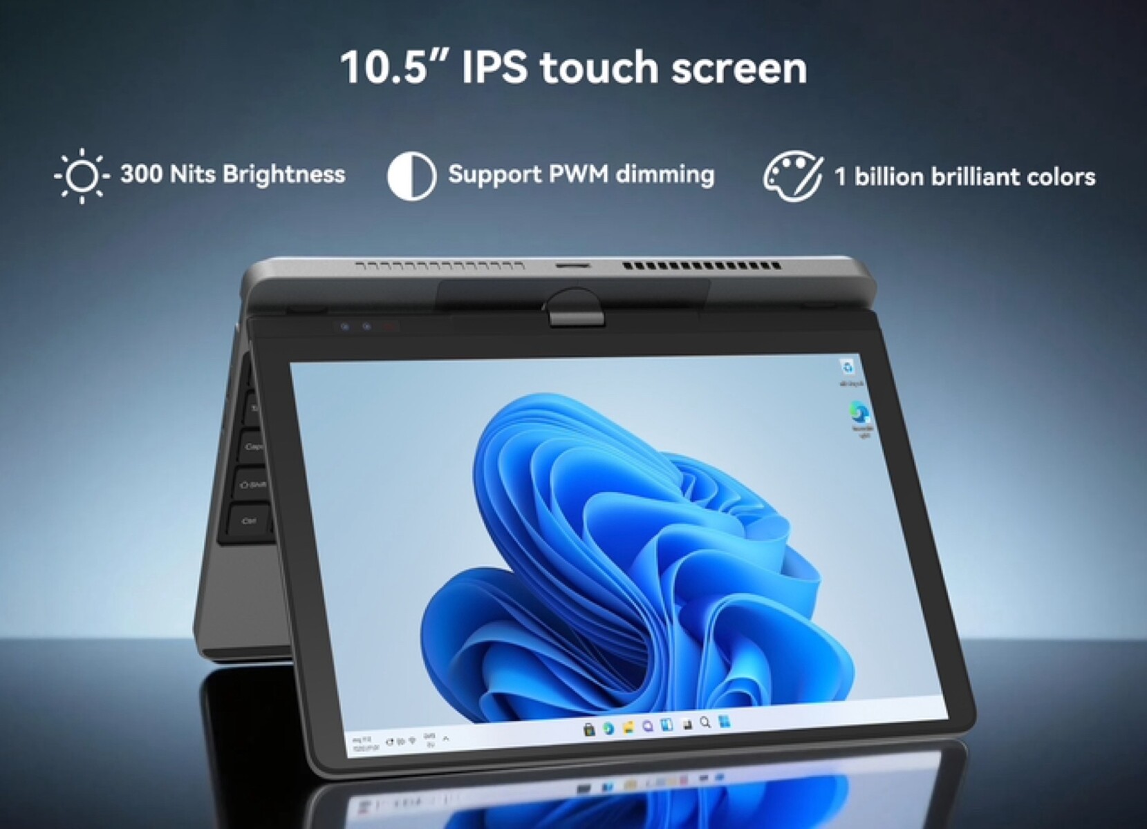Het scherm maakt gebruik van een IPS-paneel met een resolutie van 1.920 x 1.280 pixels, een piekhelderheid van 300 nits en een volledige sRGB-dekking. Naast het compacte ontwerp en het veelzijdige scharnier, is een ander opvallend kenmerk het ronde trackpad met daaromheen knoppen voor snelle aanpassingen van het volume en de schermhelderheid. De ingebouwde batterij heeft een capaciteit van 5.500 mAh, maar het bedrijf heeft geen specifieke schatting van de batterijlevensduur gegeven.