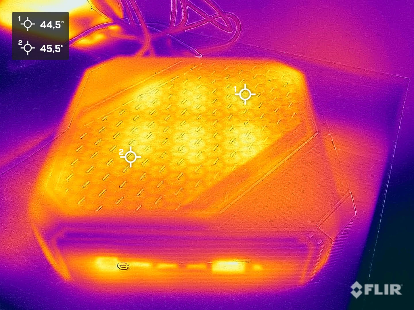 De oppervlaktetemperaturen bereiken een maximum van 48°C onder belasting, wat geen groot probleem is. Voor deze test hebben we het toestel zonder standaard gebruikt. De temperaturen dalen minimaal wanneer het apparaat met zijn standaard wordt gebruikt.