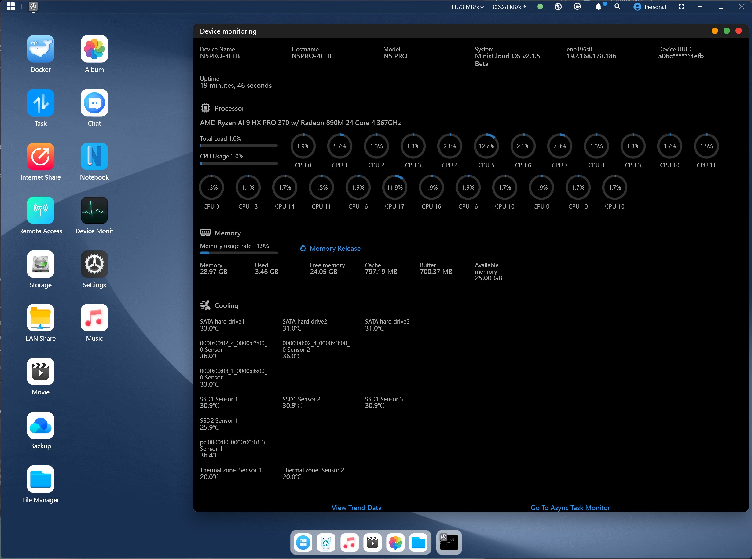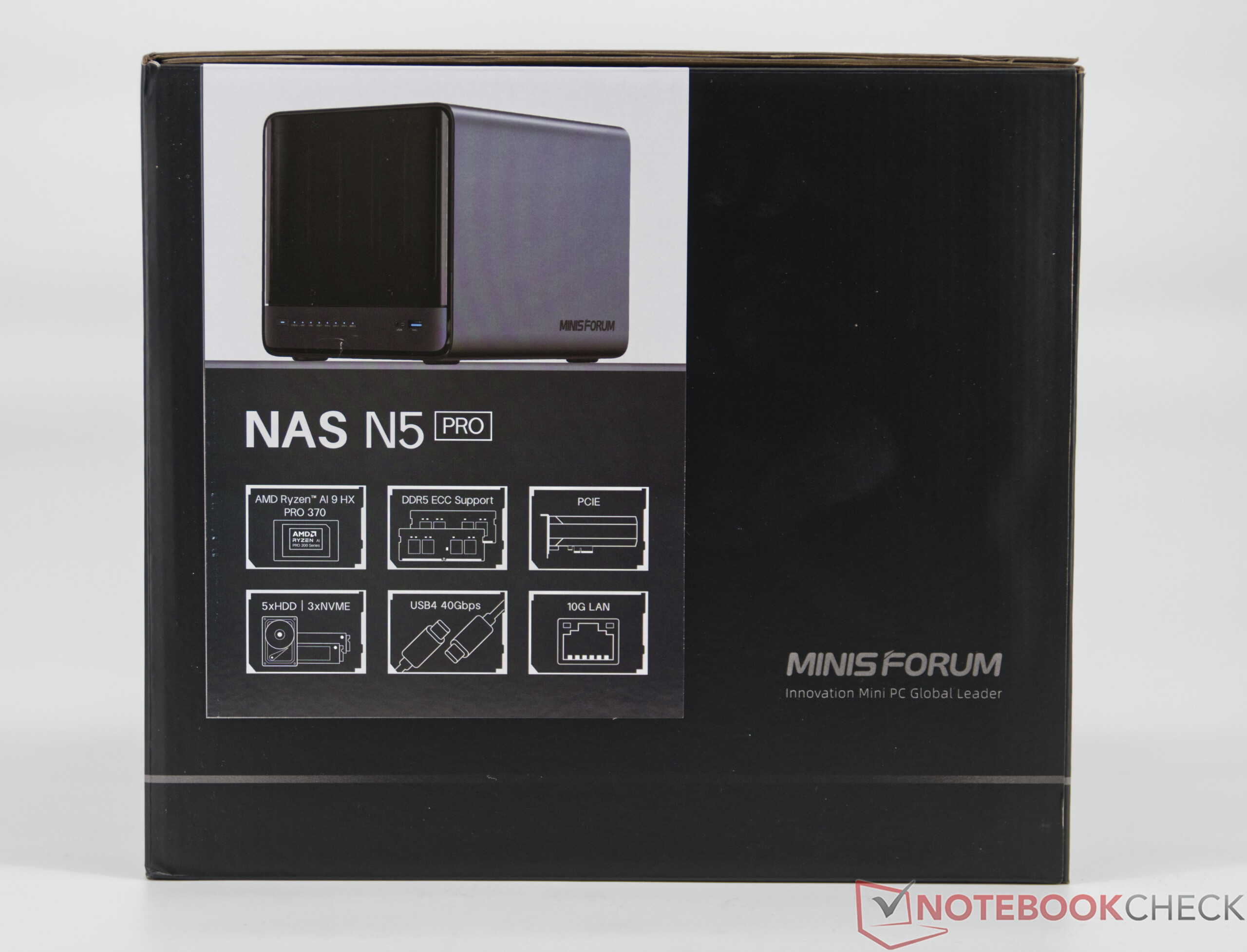 De Minisforum N5 Pro presenteert zichzelf als een machtige en moderne NAS/miniserver die indrukwekkende rekenkracht levert met de AMD Ryzen AI 9 HX PRO 370 op de Zen 5-architectuur. Met 12 cores, DDR5-ondersteuning en Radeon 890M graphics is het systeem even geschikt voor multimedia, virtualisatie en AI-gebaseerde toepassingen. Twee snelle LAN-poorten, een breed scala aan uitbreidingsopties en eenvoudig onderhoud onderstrepen de professionele standaard. Ondanks het compacte ontwerp maakt het koelsysteem indruk met lage temperaturen en gematigde geluidsniveaus.