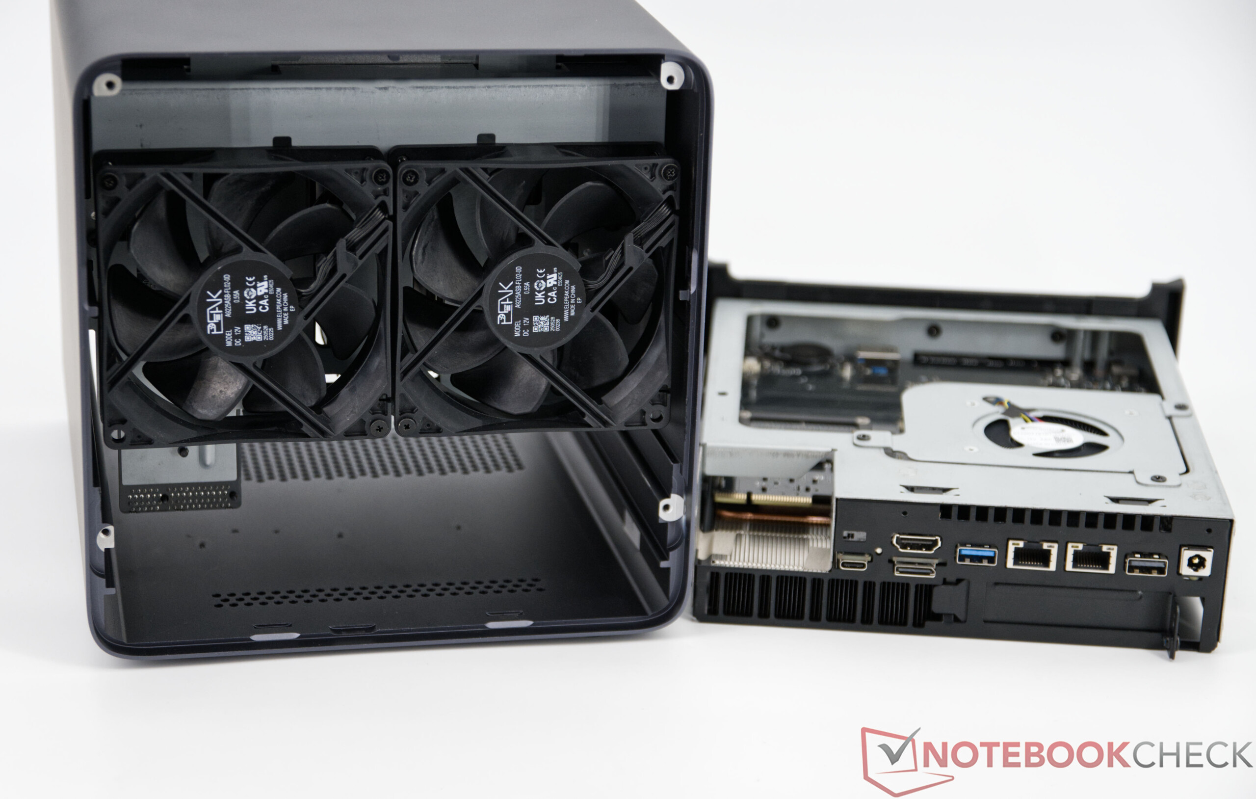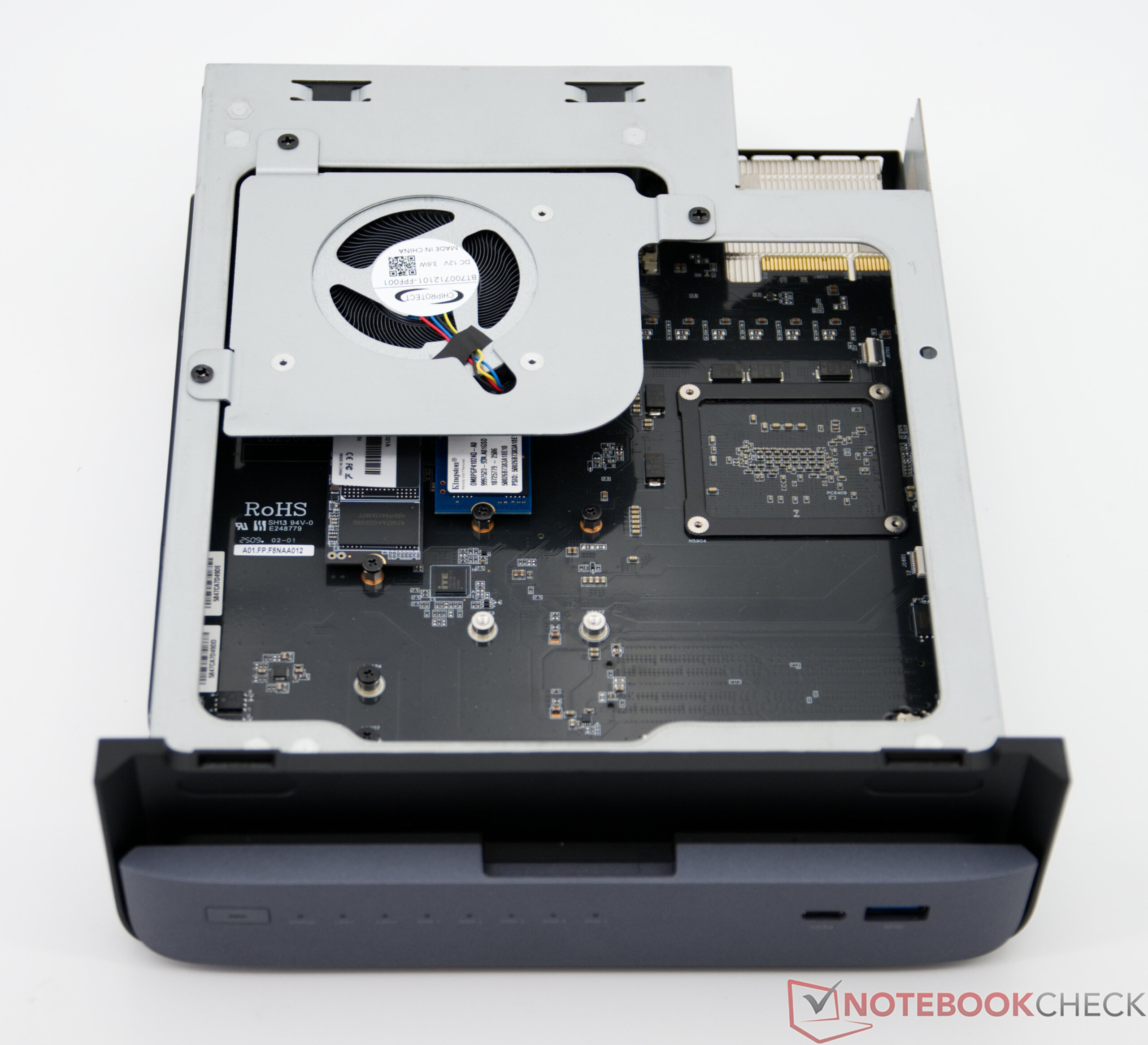 Onderhoud aan de Minisforum N5 Pro is aangenaam eenvoudig. De bays voor de harde schijf kunnen zonder gereedschap worden verwijderd en eenvoudig worden gemonteerd. De eigenlijke Minisforum PC-eenheid zit slechts met twee schroeven vast en kan na verwijdering gemakkelijk worden uitgetrokken. Uitbreidingen of schoonmaakwerkzaamheden zijn daarom ook zonder veel moeite mogelijk.