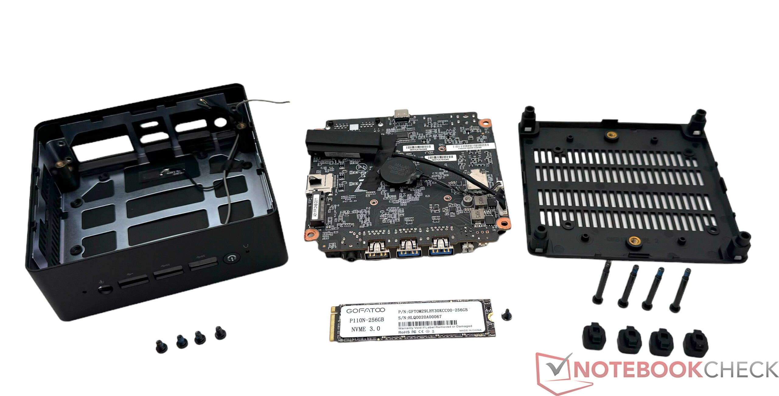 Onderhoudswerkzaamheden aan de Minisforum UM100D zijn slechts beperkt mogelijk. Het RAM en de draadloze module zijn vast geïnstalleerd, en een M.2 SSD is al voorgeïnstalleerd in alle configuraties. Deze kan zeker worden vervangen door een model met meer opslagruimte. Er kan echter ook een 2,5 inch opslagruimte in het apparaat worden geplaatst. Het apparaat is relatief eenvoudig te openen vanaf de onderkant. De vier schroeven zitten verborgen onder de rubberen voetjes, die alleen met kleine weerhaakjes zijn vastgezet en niet vastgelijmd zoals vaak het geval is. De CPU ventilator bevindt zich aan de bovenkant, wat betekent dat de hele printplaat inclusief de koeleenheid verwijderd moet worden als er schoongemaakt moet worden. Met een beetje handigheid kan dit gemakkelijk gedaan worden.