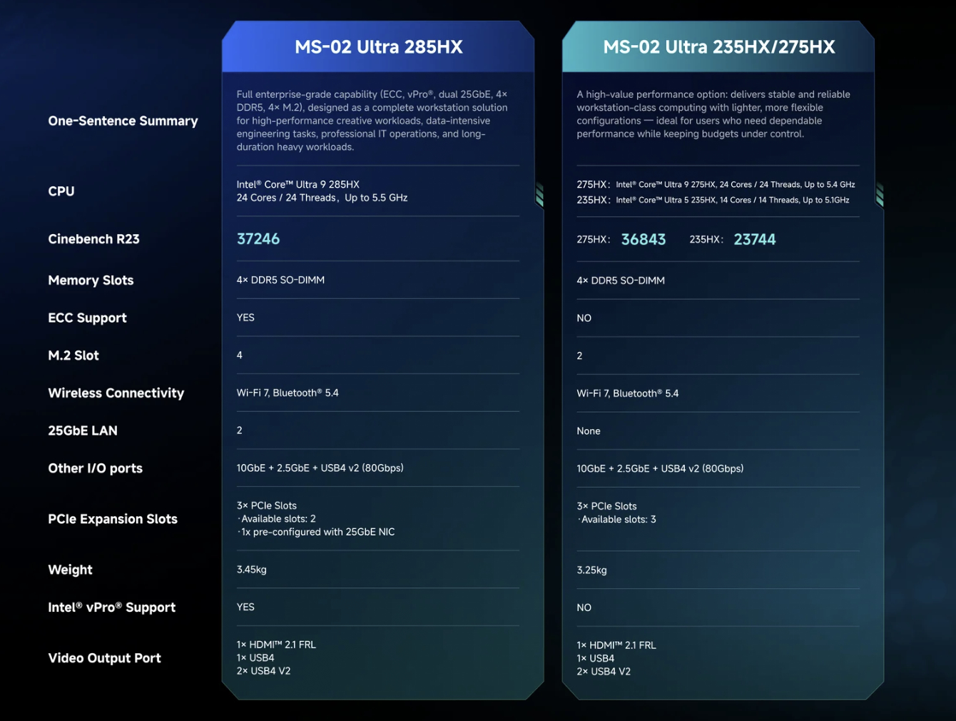 Momenteel begint de MS-02 Ultra bij $949 als een barebones unit met een Core Ultra 9 275HX processor voordat u een korting van $50 toepast bij het afrekenen met de code MS0250. Een goedkopere Core Ultra 5 235HX variant zal uiteindelijk verkrijgbaar zijn voor $719. Ondertussen zal de Core Ultra 9 285HX begint bij $1.119 en loopt op tot $2.899 met 192 GB ECC RAM en een 2 TB SSD. Houd er rekening mee dat alleen Core Ultra 9 285HX varianten dubbele 25 Gbps Ethernetpoorten bevatten.