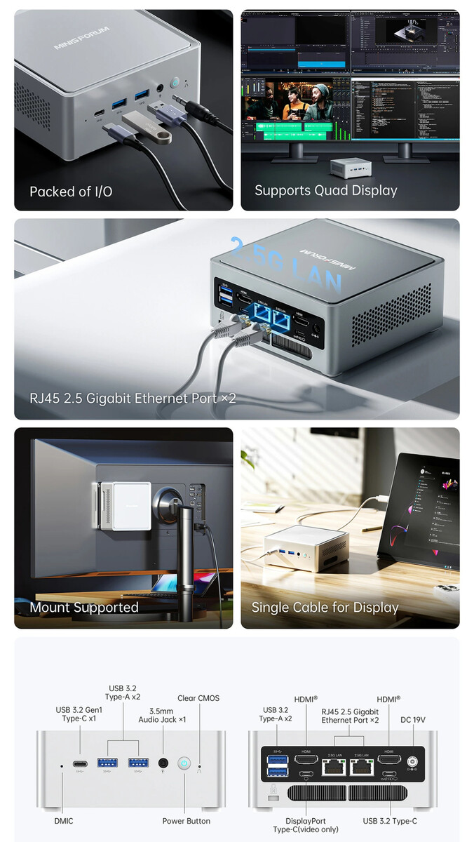 Bovendien ondersteunt de NAB3R uitbreidbare opslag en RAM, zij het slechts tot 64 GB DDR4-3200 in het laatste geval. Desalniettemin heeft Minisforum een actieve koeloplossing voor de M.2 2280 SSD van de mini-pc toegevoegd, evenals een grote turboventilator aan de onderkant. Zoals de afbeelding hieronder laat zien, heeft de NAB3R ook een groot aantal poorten aan de achterkant.