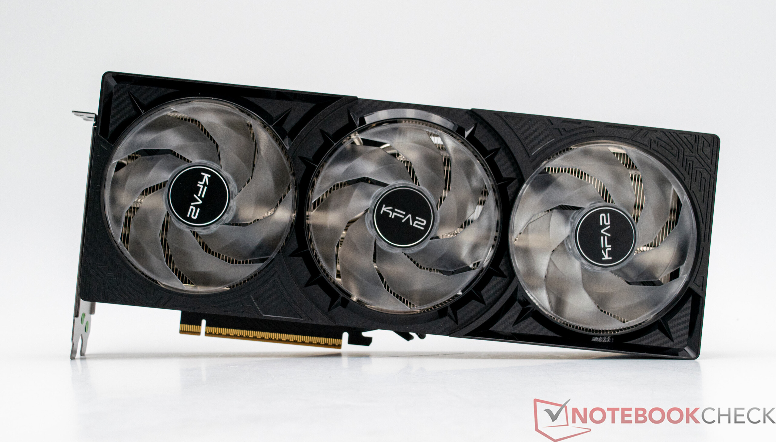 Het koelconcept van de KFA2 GeForce RTX 5070 Ti 1-Click OC is krachtig genoeg om de 300 watt onder volledige belasting af te voeren. De KFA2 vertrouwt op een grote koeler met drie 92-millimeter ventilatoren die verse lucht door de koelribben voeren. Het geoptimaliseerde ventilatorontwerp met de naam Wings 3.0 genereert naar verluidt tot 15 procent meer luchtdruk, waarbij het geluidsniveau technisch gezien iets lager ligt.
