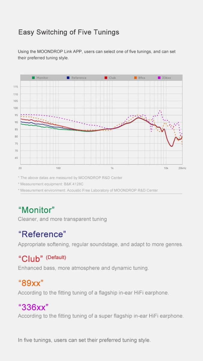 In de grijze oortelefoon zitten twee drivers verborgen - een nieuw ontwikkelde gebalanceerde armatuurtweeter van een lithium-magnesiumlegering en een dynamische driver met een diameter van 13 millimeter voor de midden- en lage frequenties. Om het geluid aan hun eigen voorkeuren aan te passen, kunnen gebruikers kiezen uit vijf afstemprofielen in de Moondrop Link smartphone app. Naast SBC en AAC ondersteunt de Moondrop Supersonic ook de nieuwe, efficiëntere LC3-codec en Sony LDAC om muziek te streamen tot 32-bit bij 96 kHz en 990 kbit/s.