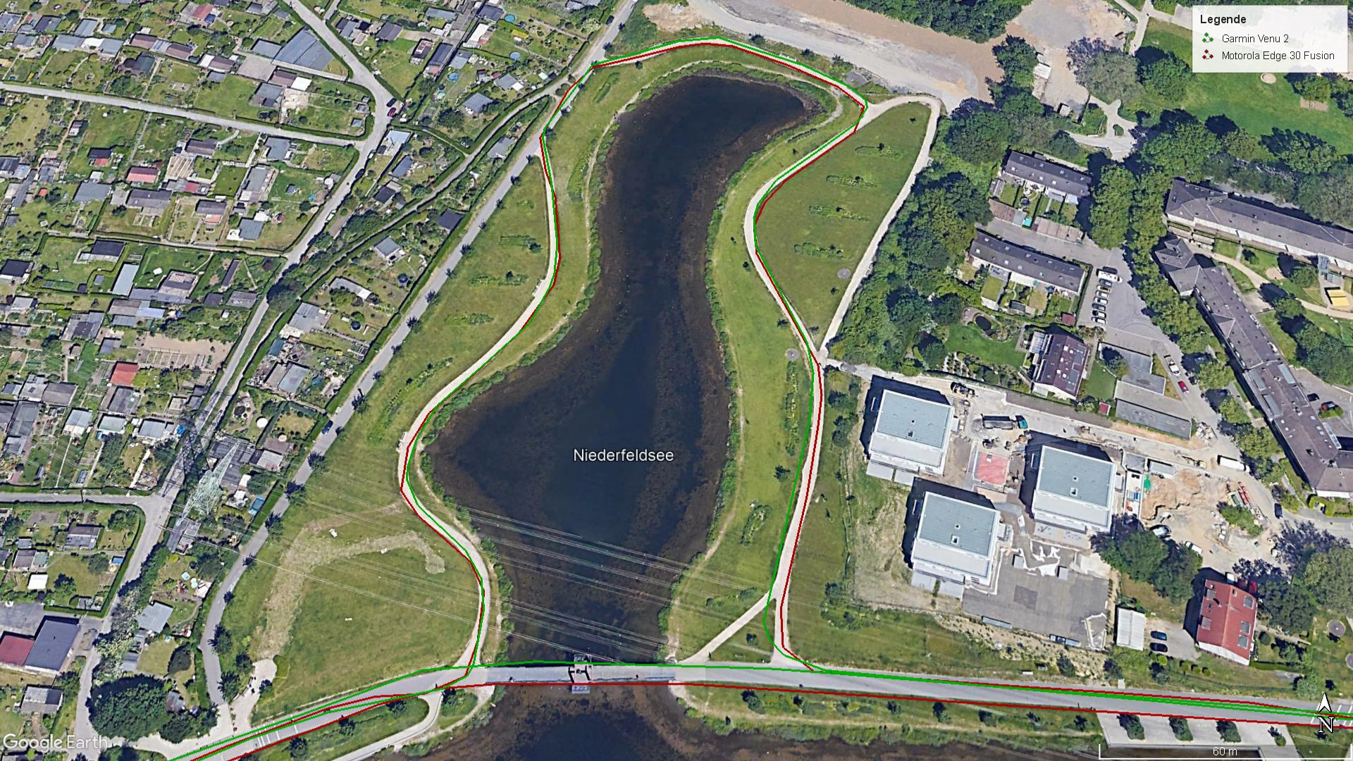 De vergelijking met ons referentietoestel, de Garmin Venu 2, laat een overtuigende satellietverbinding zien. De route wordt nauwkeurig op de kaart weergegeven, en ook bochten en afslagen worden probleemloos geregistreerd.