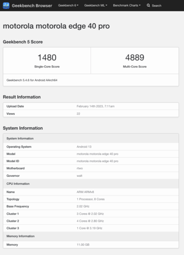 Zoals de afbeelding hieronder laat zien, heeft iemand een benchmark gedaan van wat de Edge 40 Pro lijkt te zijn met een Snapdragon 8 Gen 2 en 12 GB RAM. Hoewel het benchmarkresultaat nog niet geverifieerd is, zijn de single- en multi-core scores in lijn met wat we zouden verwachten van een toestel aangedreven door deSnapdragon 8 Gen 2. De CPU-informatie van Geekbench versterkt dit, met een enkele CPU-kern geklokt op 3,19 GHz, vier kernen op 2,80 GHz en nog eens drie kernen beperkt tot 2,02 GHz.