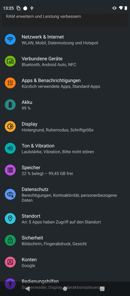 Ons testexemplaar meet een capaciteit van 128 GB aan interne UFS-opslag, terwijl ongeveer 20 GB wordt gebruikt door het besturingssysteem. Er is geen microSD-slot. Externe opslagapparaten of invoerapparaten kunnen worden aangesloten via een OTG-adapter. De USB-C poort ondersteunt USB 3.1 snelheden.