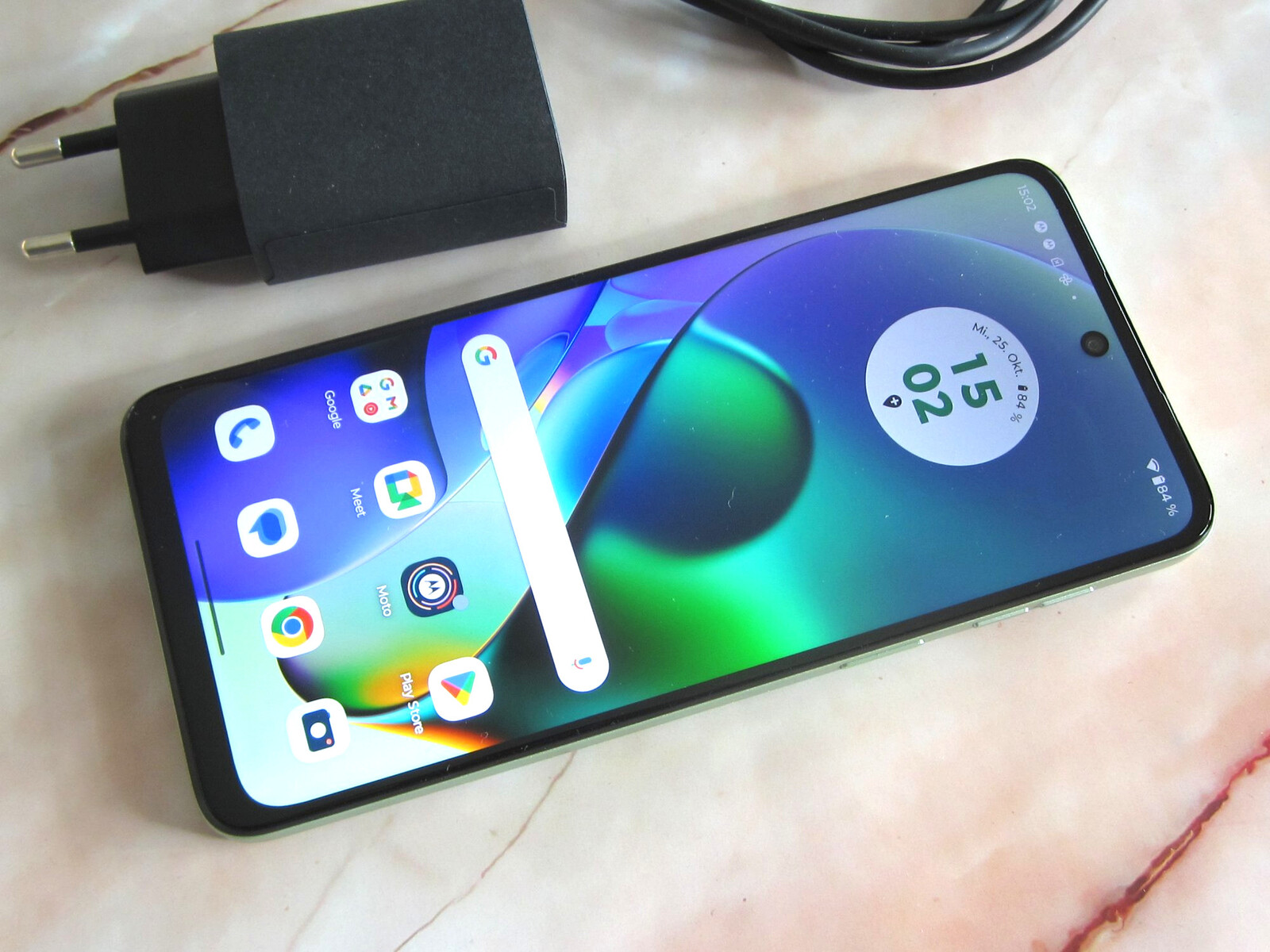 De Motorola Moto G54 wordt opgeladen met de meegeleverde oplader die tot 20 watt vermogen levert. De smartphone kan echter maar maximaal 15 watt opnemen, waardoor het opladen iets langer duurt. In onze test duurde het 2:53 uur om de lege batterij van 5000 mAh volledig op te laden tot 100%.