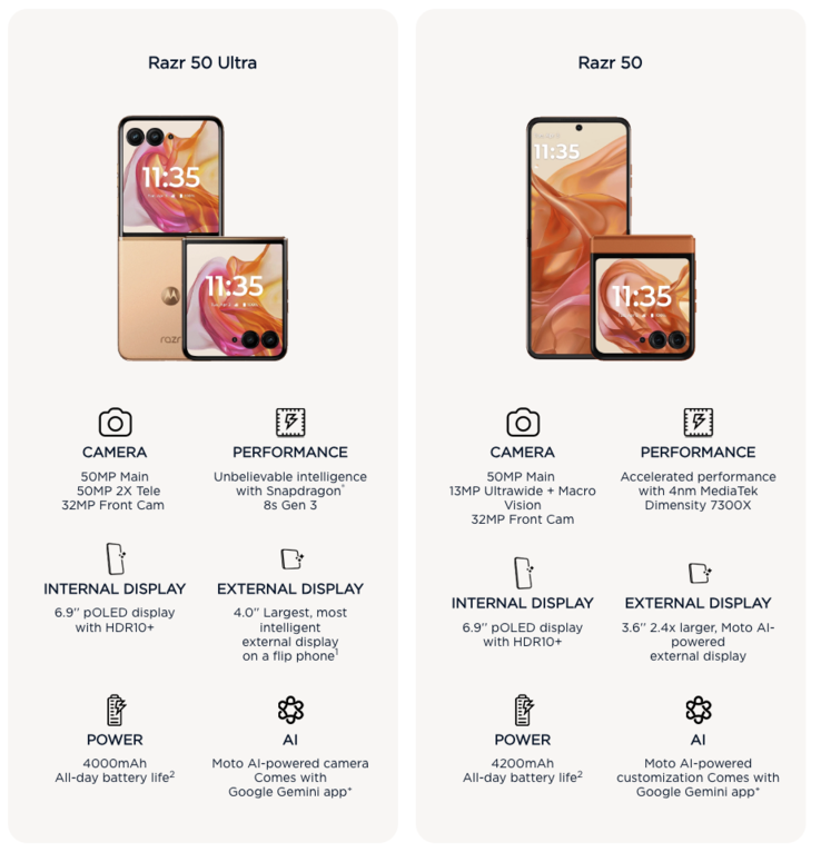 Zoals de afbeelding hieronder laat zien, zijn er veel overeenkomsten tussen de Razr 50 en Razr 50 Ultra, inclusief hun ontwerp. Motorola heeft echter een paar besparingen doorgevoerd bij de eerstgenoemde om de lanceringsprijs laag te houden, net als bij de Razr 2023 (momenteel $449,99 op Amazon), waaronder de keuze voor een zwakkere chipset en een minder capabele secundaire camera, evenals een kleiner coverdisplay. Zie onze originele Razr 50 en Razr 50 Ultra lanceringsartikelen voor meer informatie over de hardware.