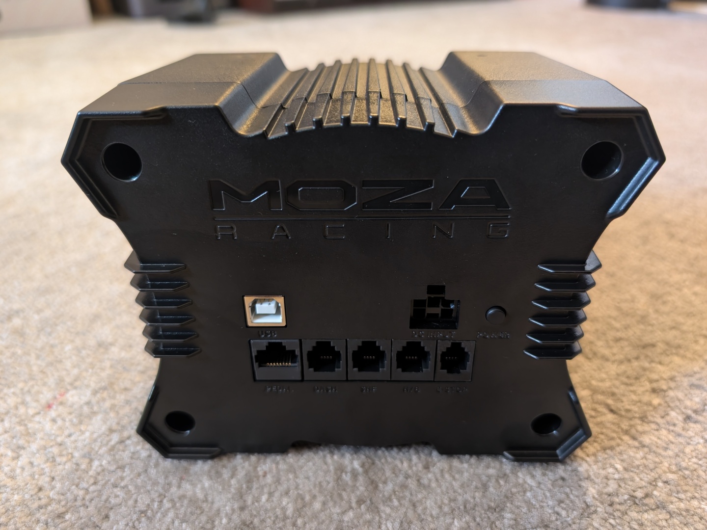 Wat betreft de wielbasis zelf, de volledig zwarte behuizing is gemaakt van een aluminiumlegering van luchtvaartkwaliteit die er robuust uitziet. Er zitten vier schroefgaten aan de onderkant voor montage op een bureau of simulator. Er zijn ook twee schroefgaten aan de bovenkant voor de bevestiging van een dashboardaccessoire. Aan de achterkant vindt u een aan/uit-knop, een DC-ingang, een USB Type-B aansluiting voor de PC-kabel en vijf accessoirepoorten. Aan de voorkant zit de motoras en het snelkoppelingsmechanisme en Moza zegt dat de R5 wielbasis compatibel is met de meeste stuurwielen en pedaalsystemen.