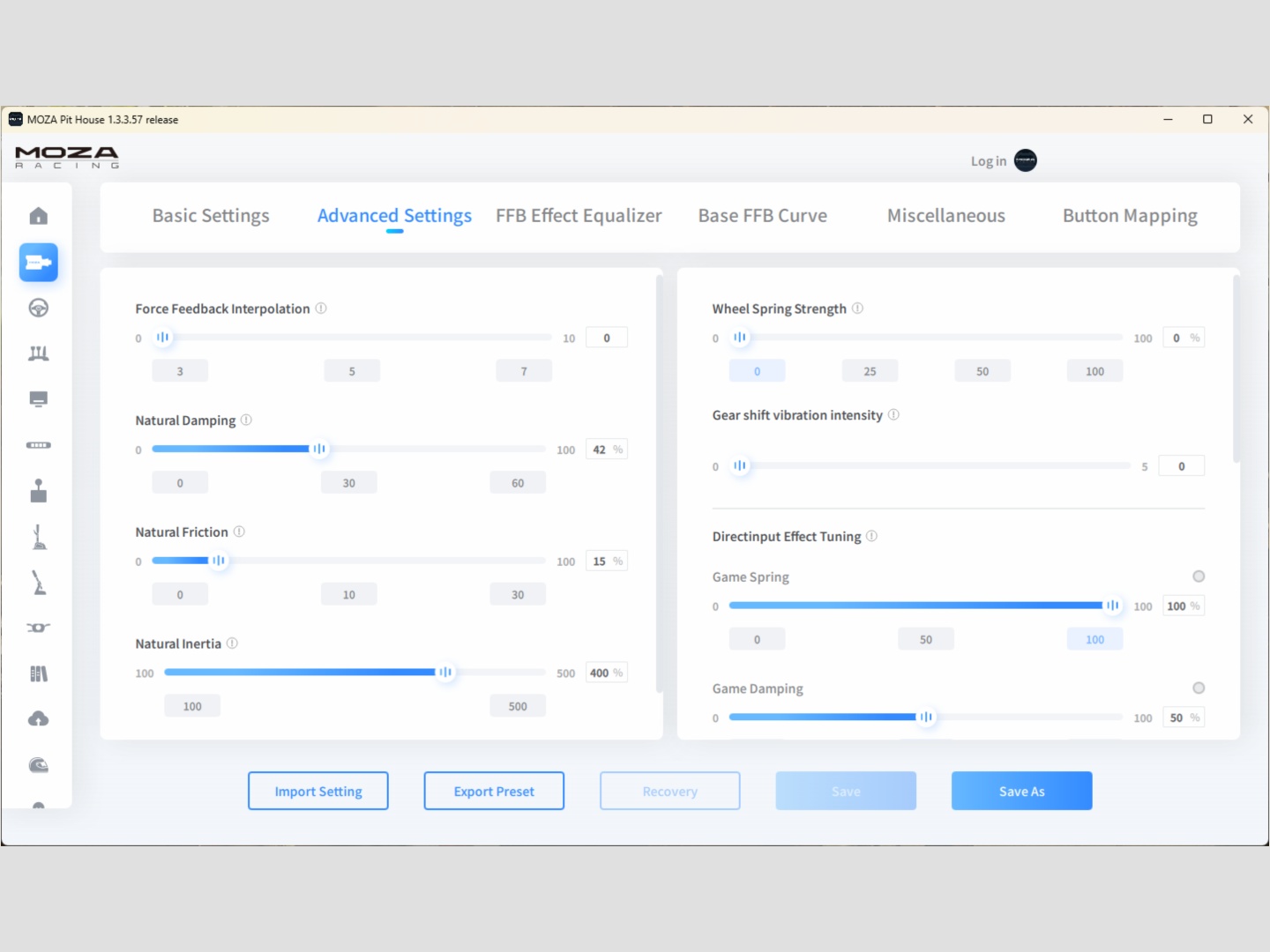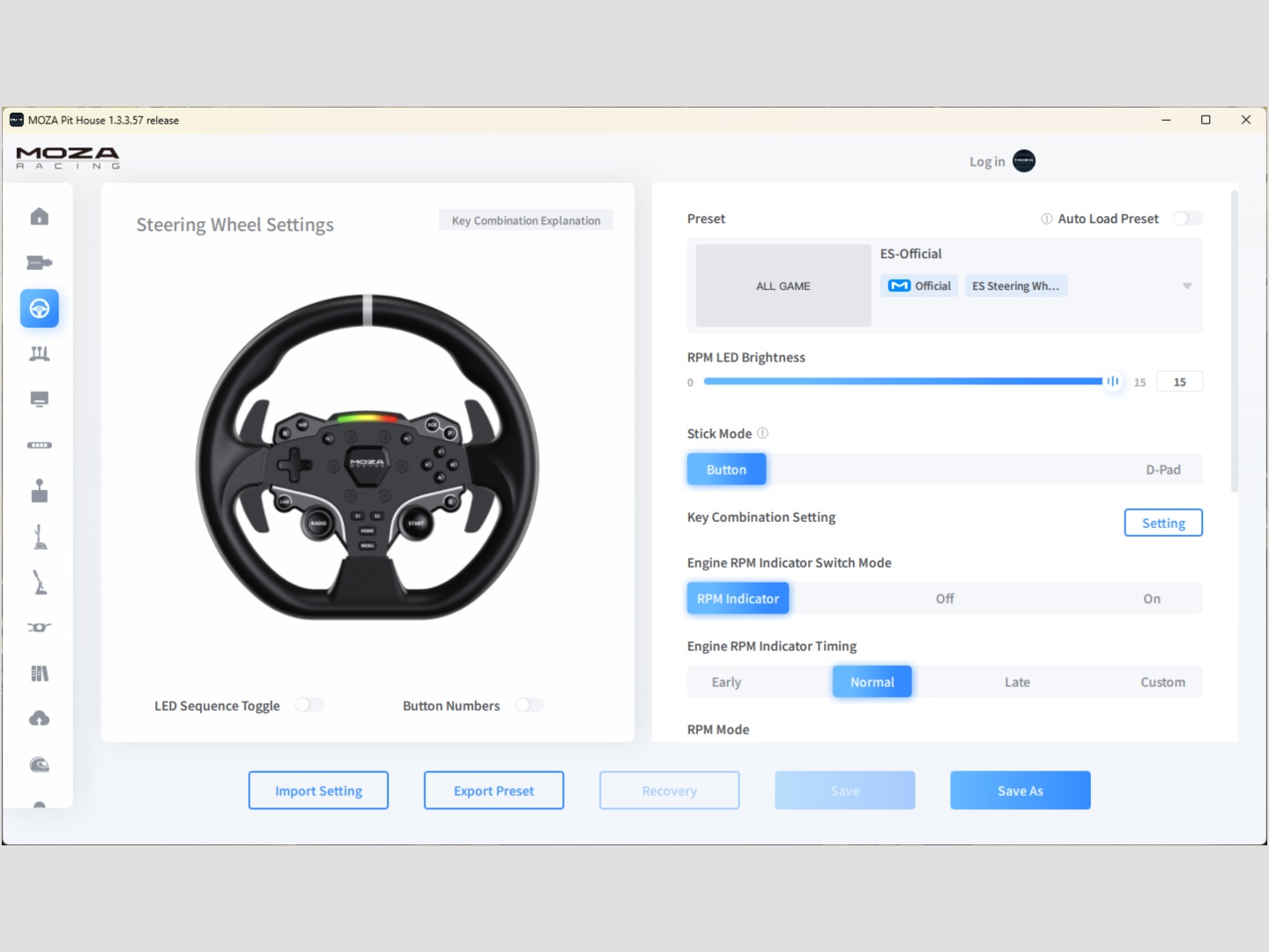 Met de Moza Pit House-software kunt u de wielbasis tot in detail aanpassen om elk aspect van de feedback te personaliseren. De software is eenvoudig te gebruiken en te begrijpen, en maakt het ook mogelijk om profielen aan te maken, te importeren en te exporteren. De rotatie en LED's in de stuurwielen kunnen ook worden aangepast aan verschillende toerentallen en kleuren.