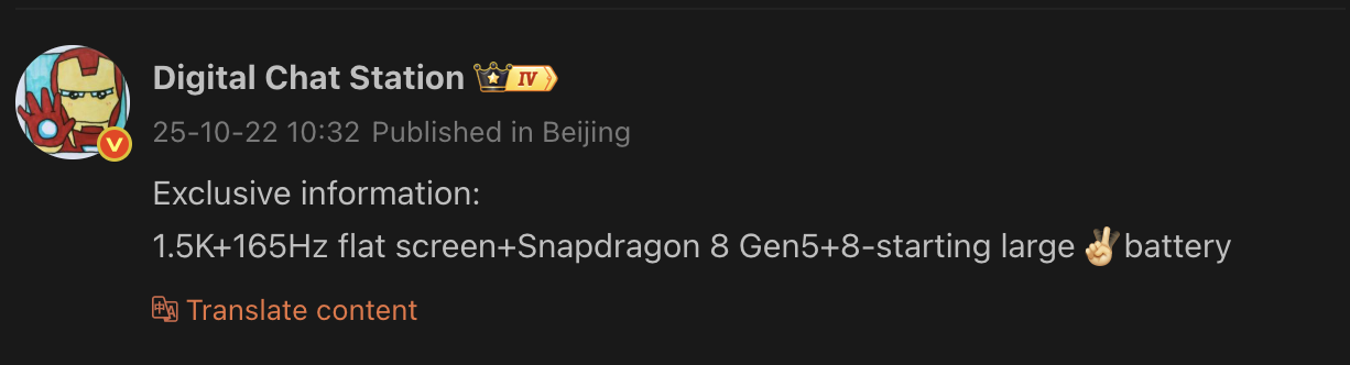 Wat betreft de releasetijdlijn suggereert de tipgever dat het toestel eind dit jaar wordt uitgebracht. Dit komt overeen met de Snapdragon 8 Gen 5 lancering, wat aangeeft dat het een van de eerste telefoons met de nieuwe chipset zou kunnen zijn.