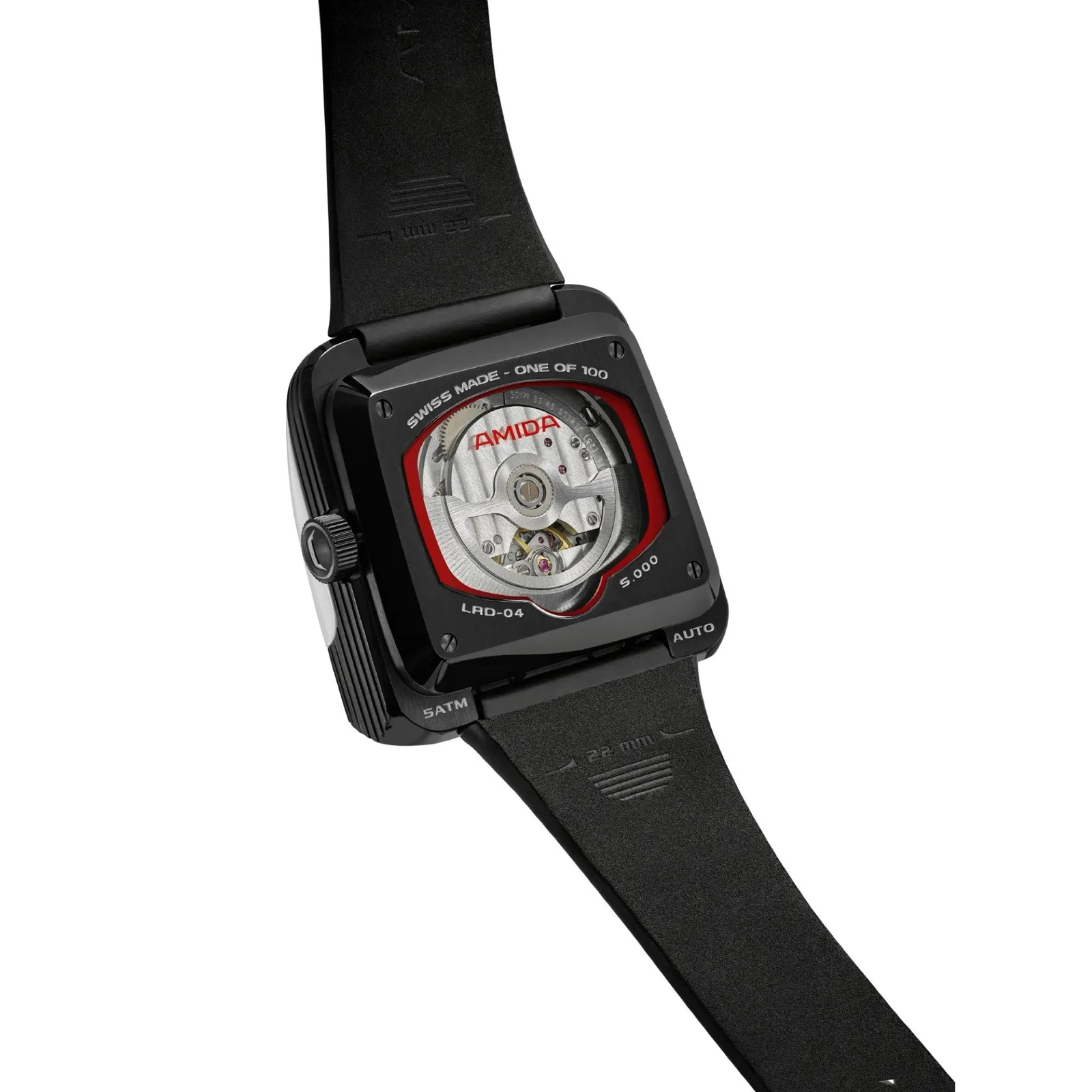 De band combineert wit leer met een klittenbandsluiting, zoals gebruikt door astronauten, waardoor de lengte van de band traploos kan worden aangepast. De achterkant is gemaakt van roestvrij staal en biedt zicht op het Soprod Newton P092 uurwerk, dat is uitgerust met 23 robijnen en slechts om de 44 uur opgewonden hoeft te worden. De bijna vierkante kast heeft een randlengte van 39 millimeter en een hoogte van 15,6 millimeter met een gewicht van 90 gram
