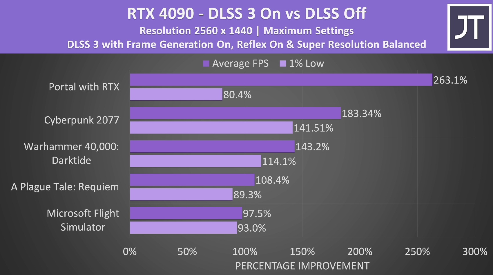 Jarrod's Techbenadrukte ook hoe deGeForce RTX 4090presteert in dezelfde games met DLSS 3 ingeschakeld en uitgeschakeld. Kortom, DLSS 3 verhoogt de FPS met 197% tot 263%, afhankelijk van de gekozen titel, waarbij NVIDIA's prestatieclaim van 300% een best-case scenario lijkt. Ondertussen is deGeForce RTX 409072,4% tot 135,8% Blender rendering prestatieverbeteringen. Zie de video hieronder voor Jarrod's Tech's volledige bevindingen.