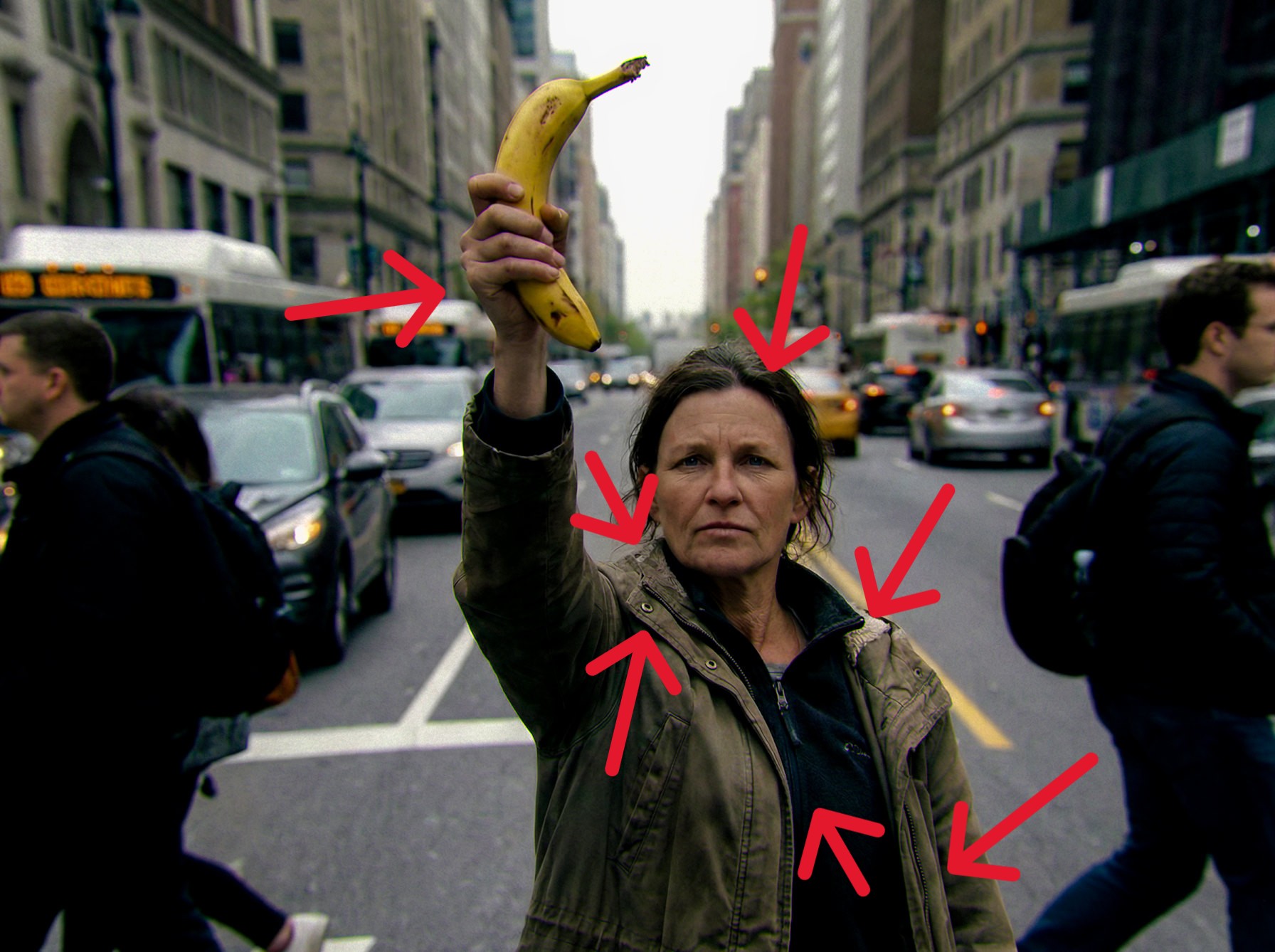 Als het op handen aankomt, is zelfs de meest geavanceerde Google AI niet immuun voor kleine inconsistenties. Als we naar de details kijken, zien we dat de vingers en de hand van de vrouw die de banaan vasthoudt niet helemaal anatomisch correct zijn. Verschillende inconsistenties vallen vooral op bij de middelvinger. De vinger en nagel zijn te breed, het voorste gewricht van de vinger heeft geen articulatie, en op de een of andere manier is de verbinding met de hand ook niet overtuigend. Daarbij komen nog de huidplooien tussen de vingers, die doorlopen tot aan de knokkels.