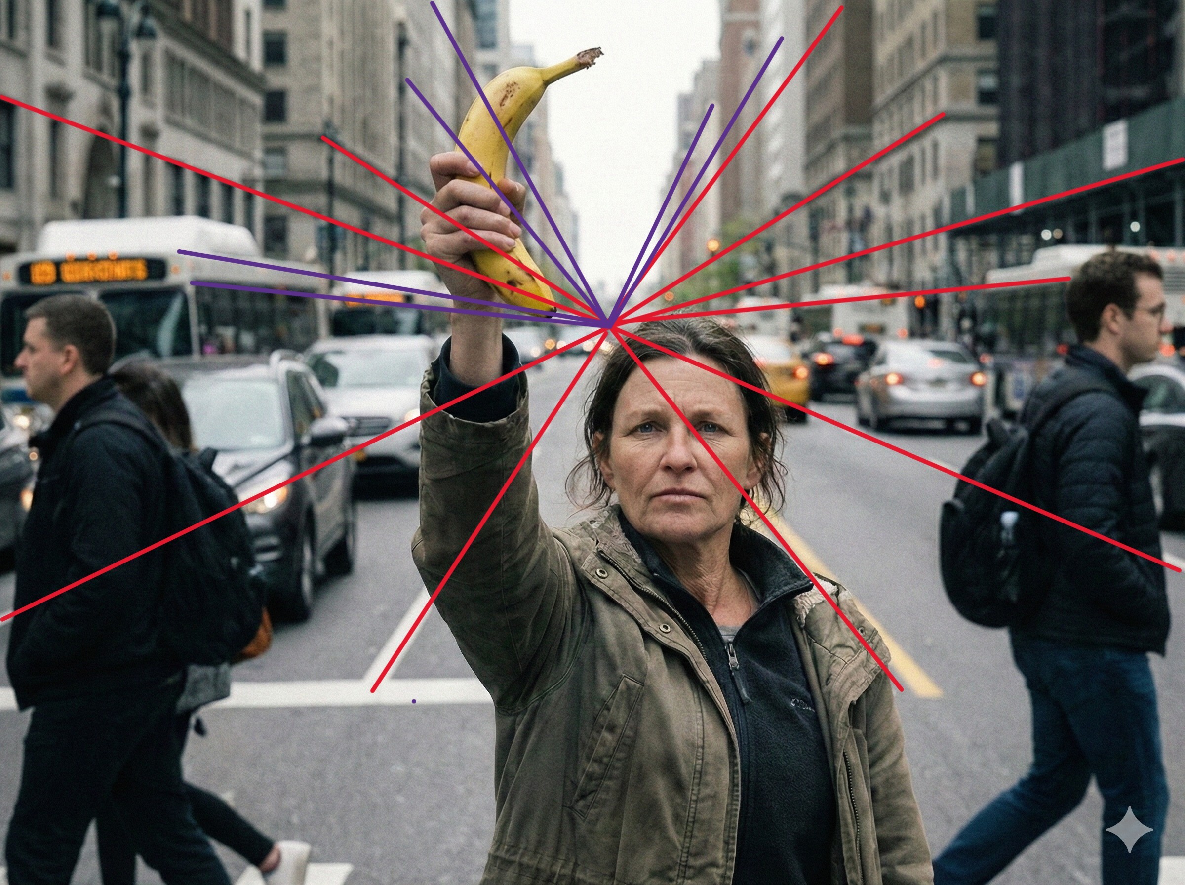 De duivel zit ook hier in de details. Gemini, of eigenlijk Nano Banana Pro, doet goed werk met het weergeven van perspectief. Op het eerste gezicht is slechts één verdwijnpunt zichtbaar. Als u echter beter kijkt, ziet u dat, ondanks de vervaging, sommige verdwijnpuntlijnen verdiepingen doorkruisen of, in het geval van de twee bussen aan de linkerkant, gewoon in het niets verdwijnen. We hebben de lijnen die we als inconsistent beschouwden paars gekleurd in de afbeelding nadat we het verdwijnpunt van het perspectief hadden bepaald
