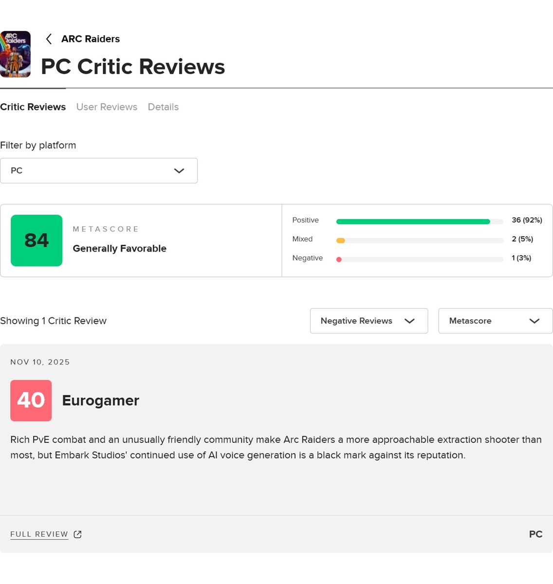 De Embark Studios extractie shooter Arc Raiders heeft de verwachtingen overtroffen voor spelersaantallen. De meningen van de media zijn ook positief, met een Metacritic-waardering van 84. Eén score springt er echter uit als een zere duim, als de enige negatieve Arc Raiders recensie op de aggregator. Eurogamer gaf het spel een 2/5 beoordeling, voornamelijk vanwege het gebruik van generatieve AI.