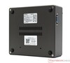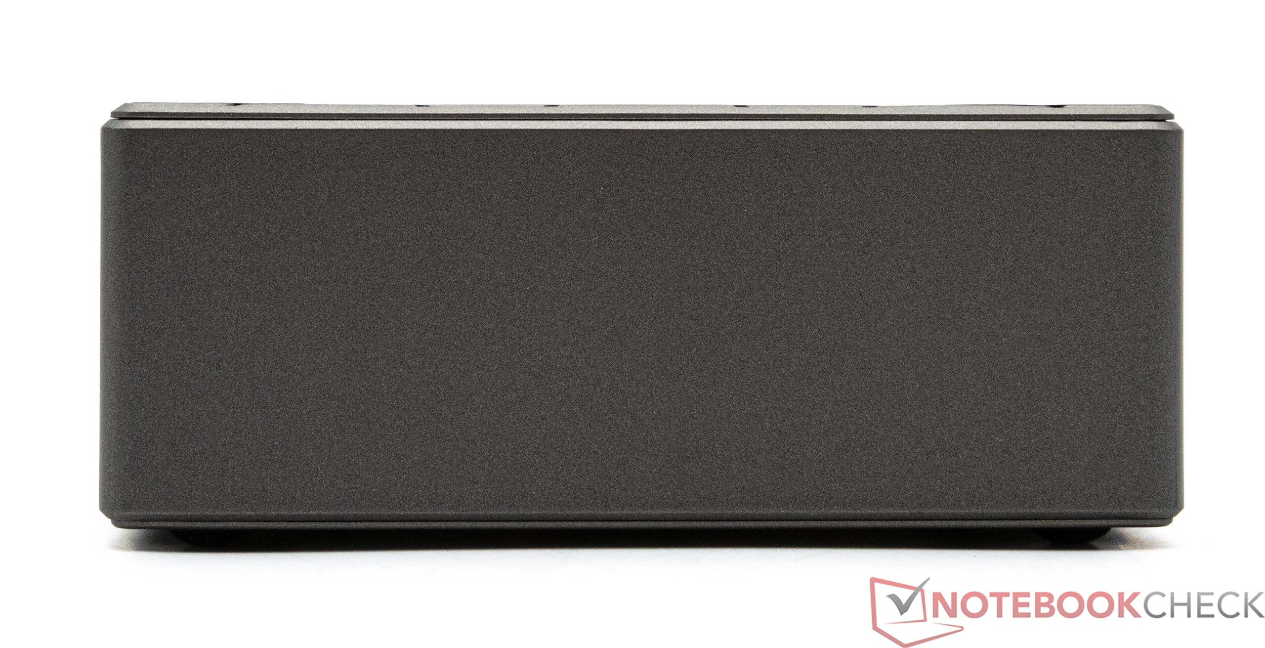 Binnen ons vergelijkingsveld is zijn voetafdruk van 3,7 x 12,5 centimeter eigenlijk aan de kleine kant. De compacte PC heeft een hoogte van precies vijf centimeter. Qua materialen vertrouwt hij vrijwel volledig op het gebruik van plastic. De fabrikant heeft besloten om geen extra metalen frame toe te voegen om structuur aan het apparaat te geven. De impliciete vingerafdrukscanner aan de bovenkant heeft echter geen functie. Het lijkt erop dat de fabrikant deze behuizing ook voor andere configuratieopties gebruikt.