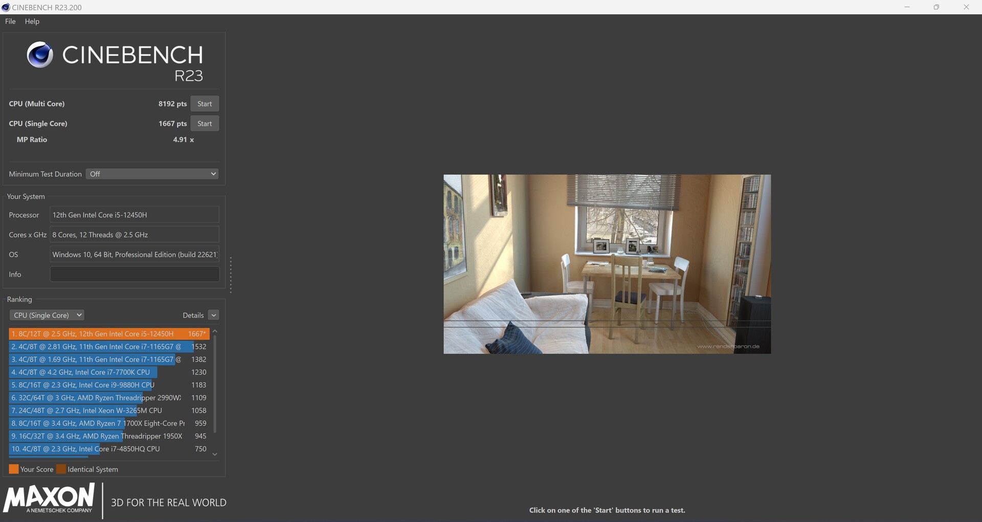 De NiPoGi CK10 heeft eenIntel Core i5-12450Hgeïnstalleerd. Met zijn acht native rekenkernen kan de SoC tot 12 threads tegelijk verwerken. De fabrikant heeft het stroomverbruik van de SoC beperkt tot 35 watt, wat resulteerde in iets slechtere multi-thread prestaties in onze test. In directe vergelijking met deMinisforum Venus-serie UN1245in de gemiddelde prestatievergelijking kunt u echter zien dat deze beperking eigenlijk maar een kleine invloed had, omdat de NiPoGi CK10 in staat was om goede single-core prestatieresultaten te behalen ondanks deze vermogenslimiet.