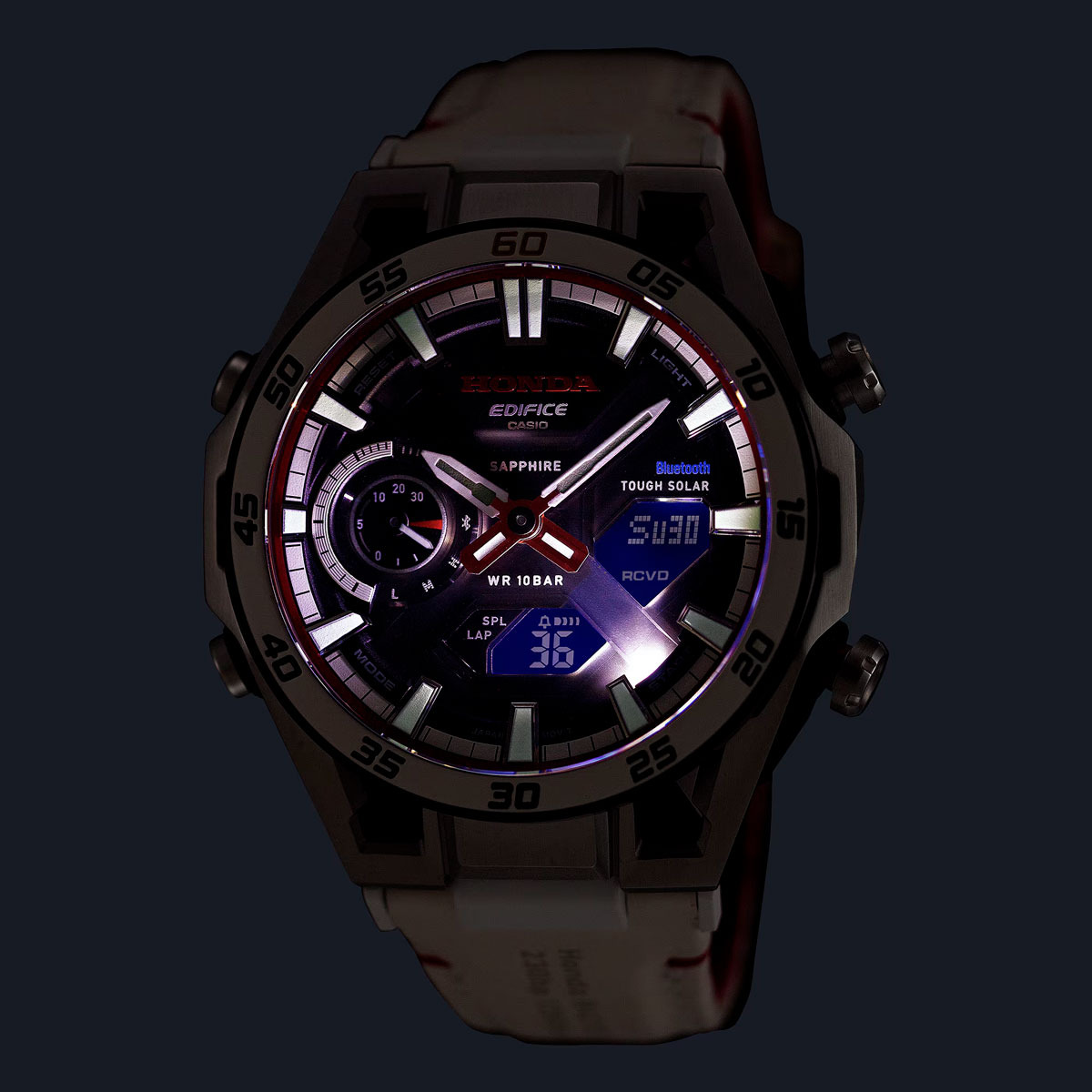 Veel ontwerpdetails verwijzen rechtstreeks naar Honda's motorsportgeschiedenis. De opvallende witte keramische lunette heeft dezelfde kleur als Championship White - de officiële overwinningskleur van Honda's auto's, ook met een gouden accent op "60" om het mijlpaaljaar aan te geven. De schaal van de bezel telt op in stappen van vijf seconden, een leuk detail dat niet te vinden is op de basis ECB-2300 modellen.