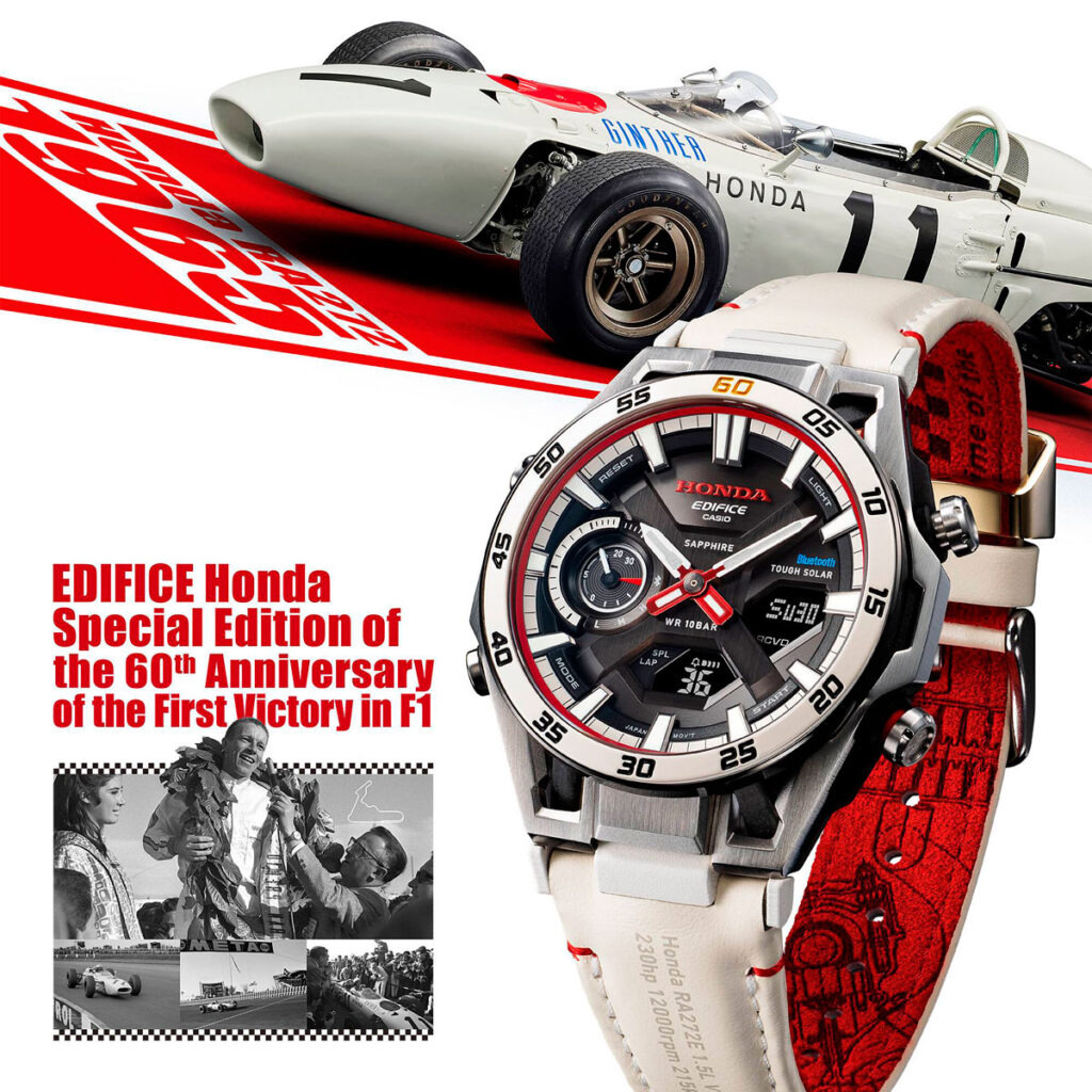 Te midden van een heleboel nieuwe Casio horloges die dit najaar arriveren, heeft de Japanse uurwerkfabrikant nu de ECB-2300HR-1Aeen speciaal Edifice Honda-model ter ere van de 60e verjaardag van Honda's eerste Grand Prix-overwinning in de Formule 1. Het is een model in gelimiteerde oplage en het haalt vintage (en technische) inspiratie uit Honda's F1-overwinning in 1965 in Mexico met de RA272, de eerste Japanse auto en het eerste Japanse team dat op dat niveau zegevierde.