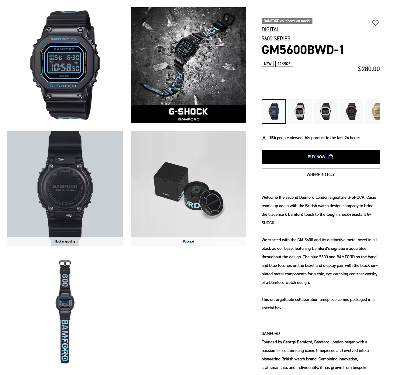 Casio noemt het bandje een band van kunsthars op biologische basis, met een maat die past om polsen van 145 mm tot 215 mm. Het horloge gebruikt mineraalglas in plaats van saffier. Voor kopers in de VS wordt het horloge rechtstreeks via de website van Casio verkocht en in een speciale Bamford-verpakking geleverd. Hoewel het geen genummerde gelimiteerde oplage is, lijkt de beschikbaarheid meer gecontroleerd dan bij standaard GM-5600 releases, waardoor de voorraad in kleinere batches kan blijven bewegen.