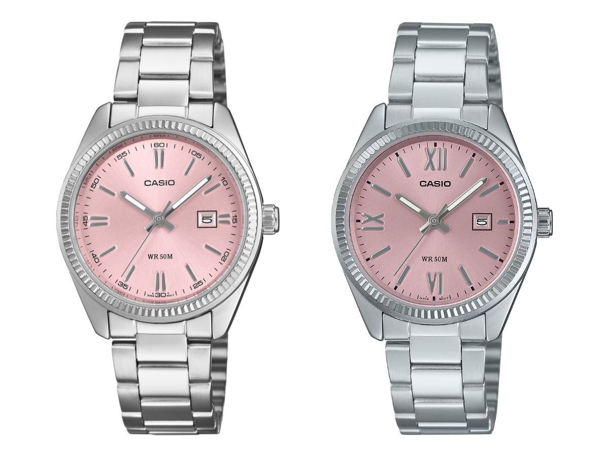 Casio's nieuwe LTP-1302PD-4AV heeft een pastelroze sunray wijzerplaat met zilverkleurige indexen en wijzers. Deze passen bij de zilverkleurig verchroomde behuizing, die 34,5 x 30,2 x 8,7 mm (~1,36 x 1,19 x 0,34 inch) meet. Dit model heeft ook een roestvrijstalen armband en een geribbelde lunette.