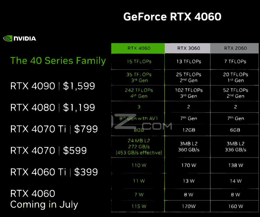 De GeForce RTX 4060 zal naar verwachting pas in juli op de markt komen, dezelfde maand als de 16 GB versie van de RTX 4060 Ti. Echter, VideoCardz heeft gelekt officiële dia's voor de eerstgenoemde, waarin verschillende specificaties en prestatiecijfers worden gedetailleerd. Ter referentie, de RTX 4060 zal uiteindelijk aankomen met de AD107 GPU, die 3.072 CUDA-kernen en een kloksnelheid van 2,4 GHz zal bieden. NVIDIA zal de entry-level GPU koppelen aan 8 GB GDDR6 VRAM geklokt op 17 Gbps op een 128-bit geheugenbus. Daarmee levert de RTX 4060 272 GB/s geheugenbandbreedte, 16 GB/s minder dan de RTX 4060 Ti serie.